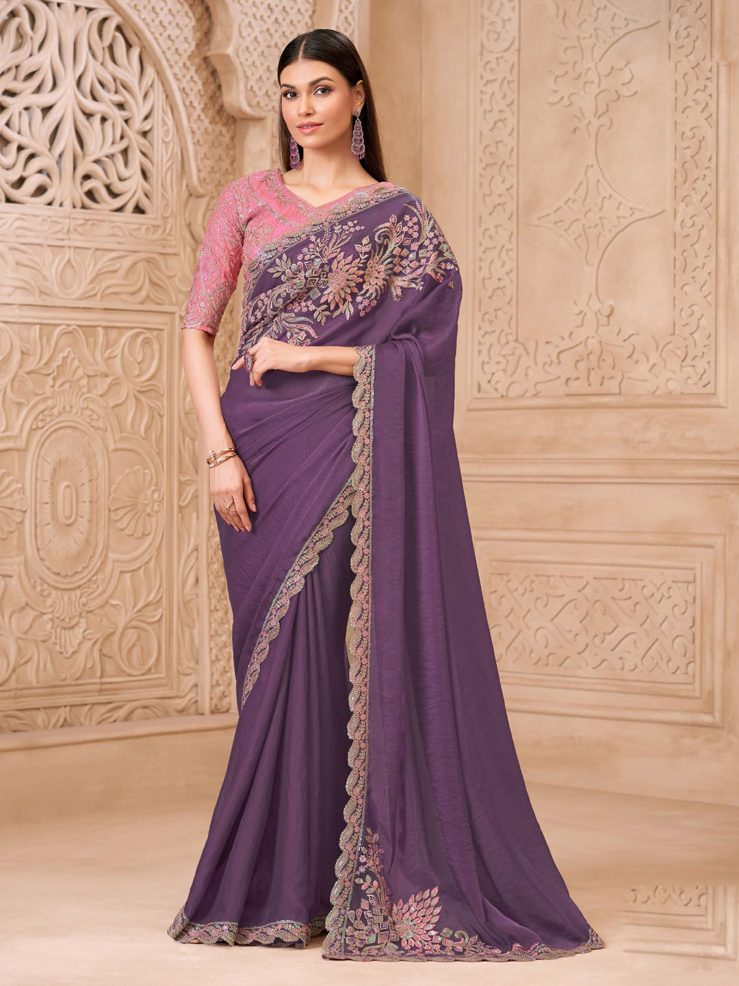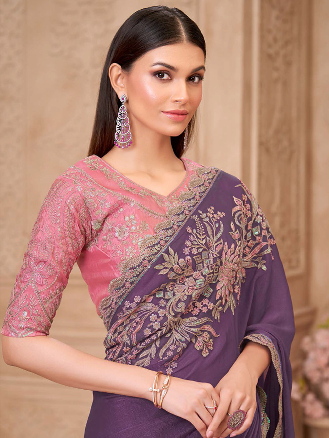 Purple and Violet color Saree in Georgette fabric with Embroidered, Sequence work
