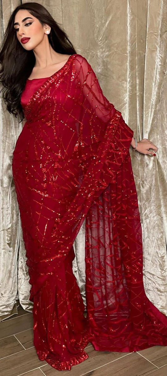 Red and Maroon color Saree in Georgette fabric with Sequence work