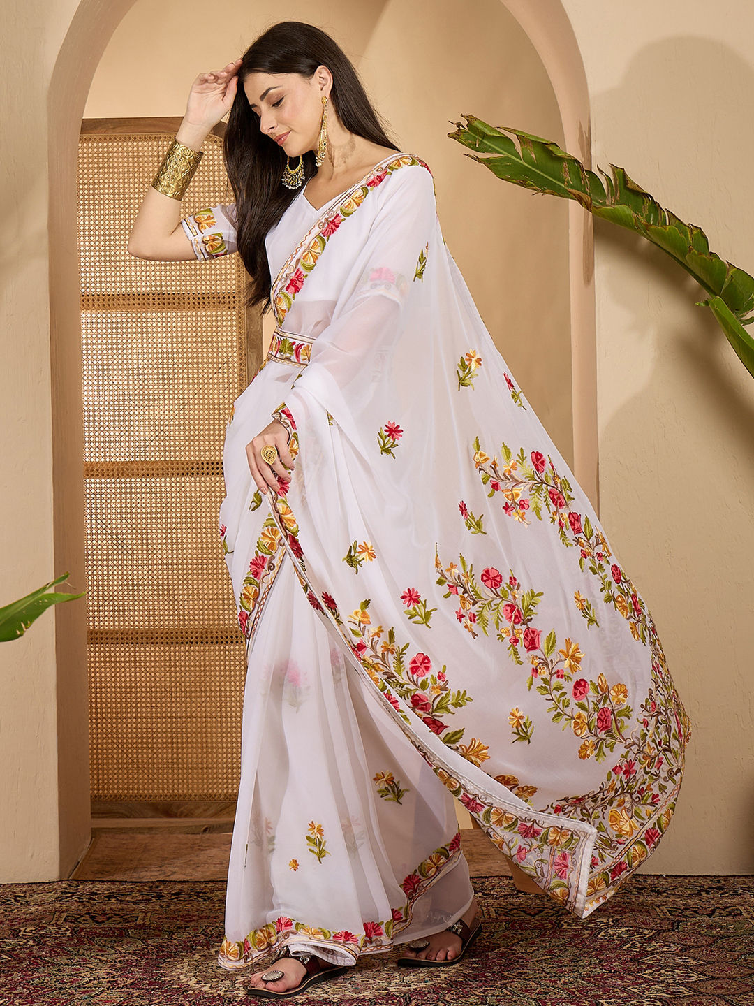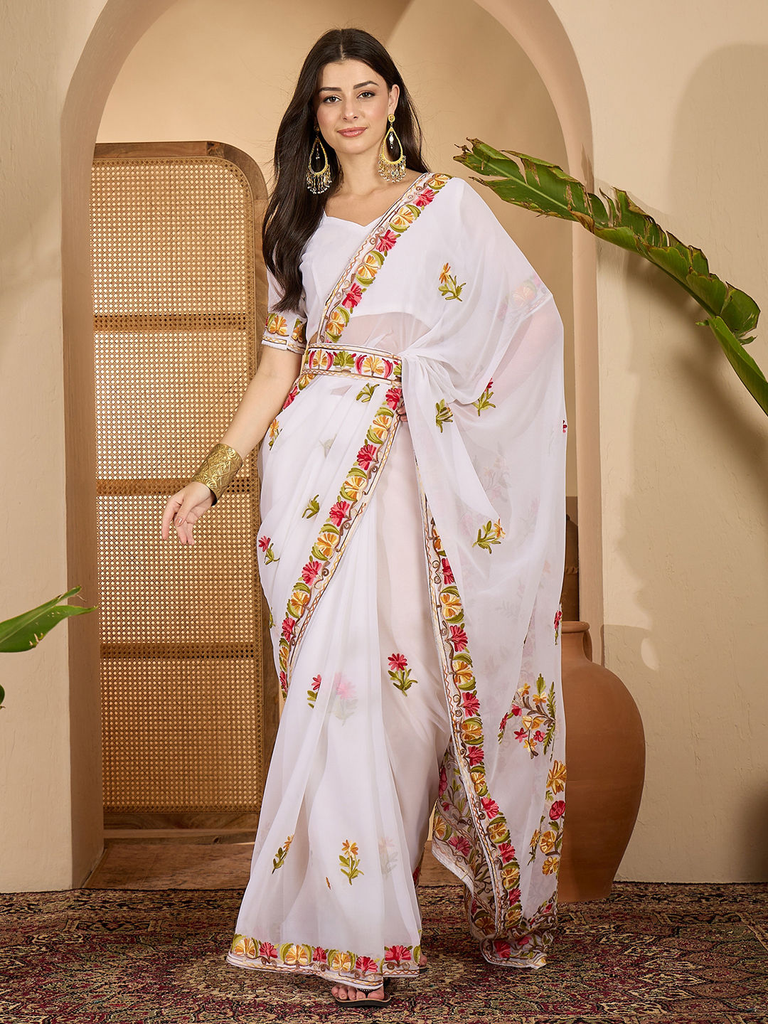 White and Off White color Saree in Georgette fabric with Embroidered, Resham, Thread work