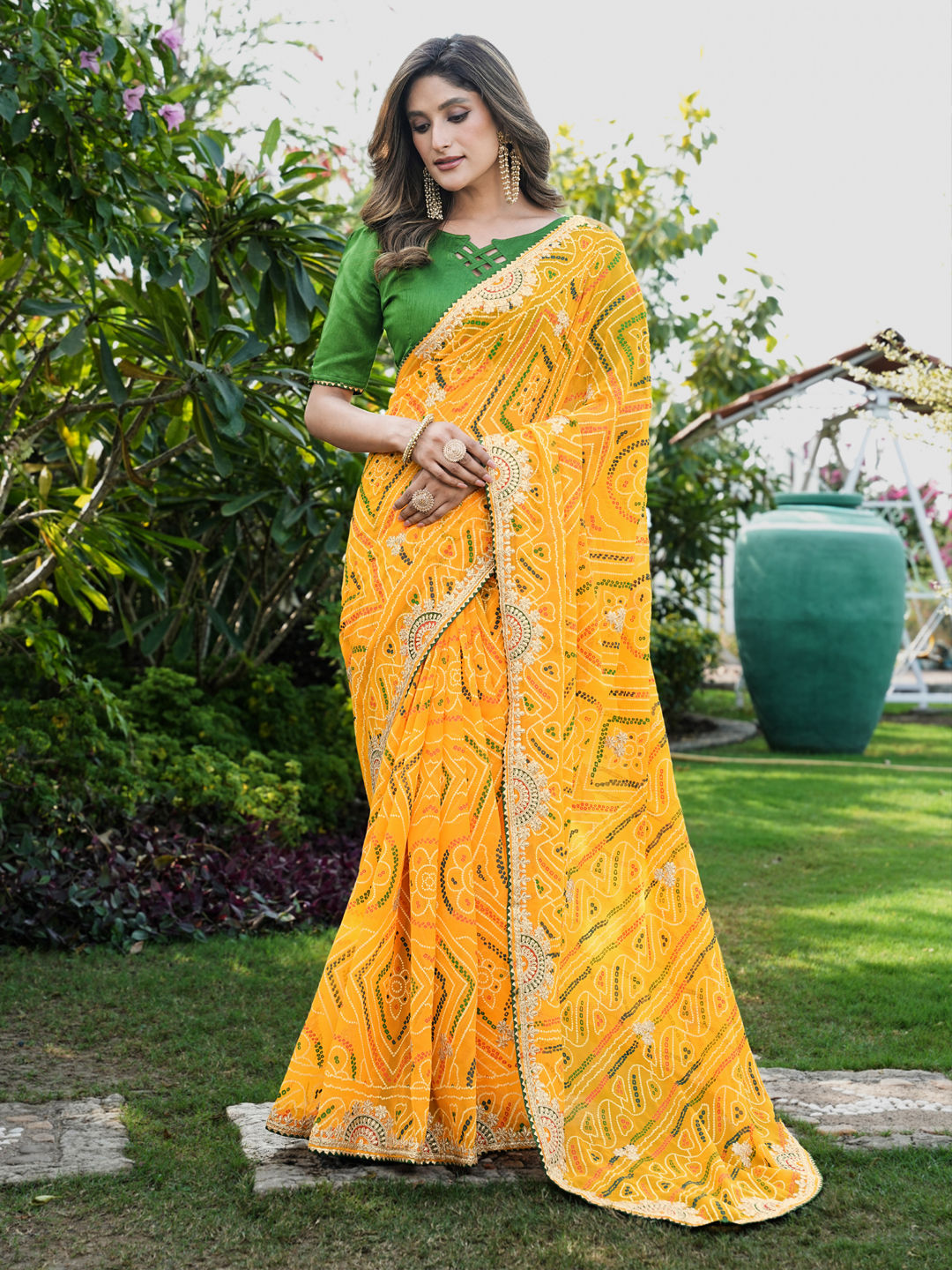 Yellow color Saree in Georgette fabric with Bandhej, Embroidered, Lace, Printed, Thread, Zari work