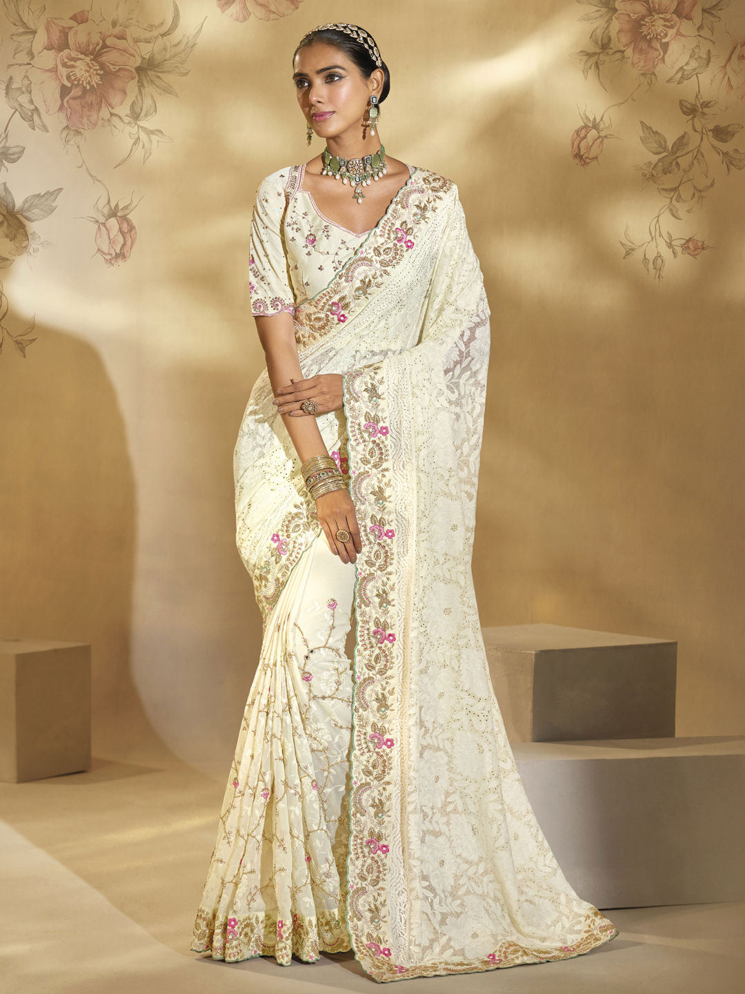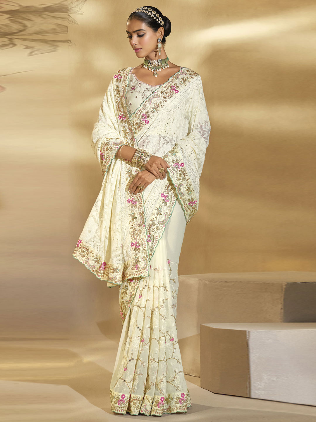 Beige and Brown color Saree in Georgette fabric with Cut Dana, Mirror, Moti, Thread, Zari work