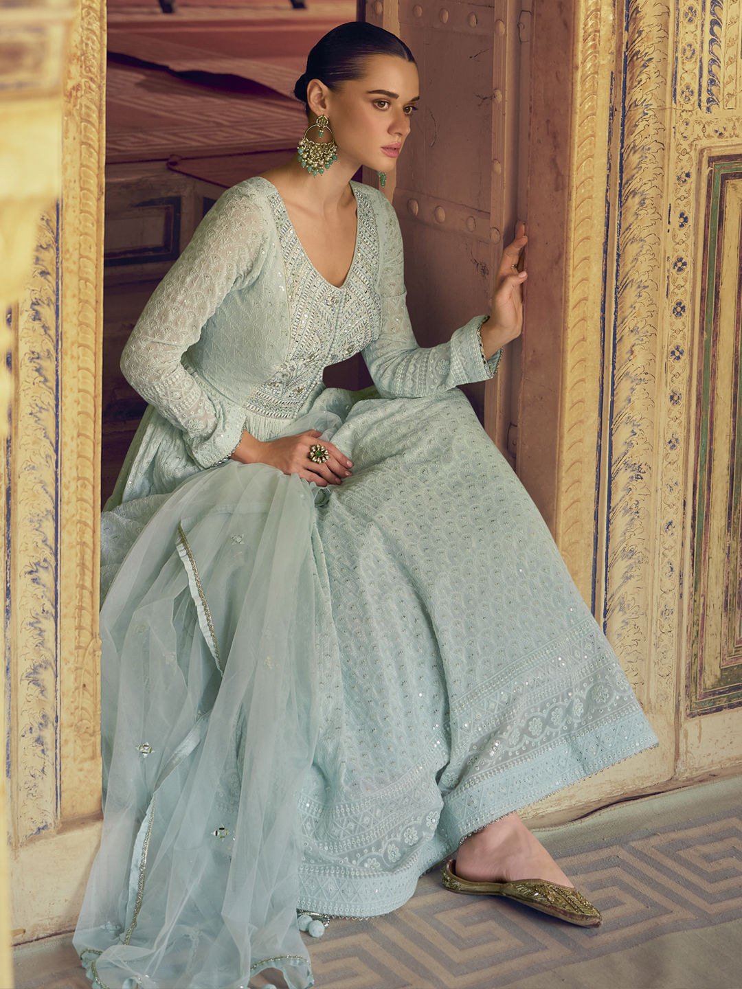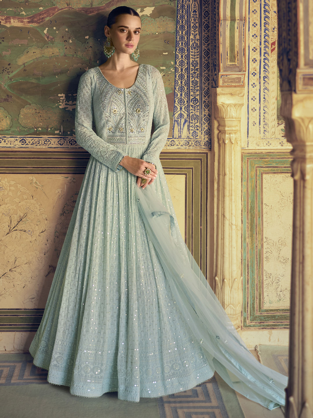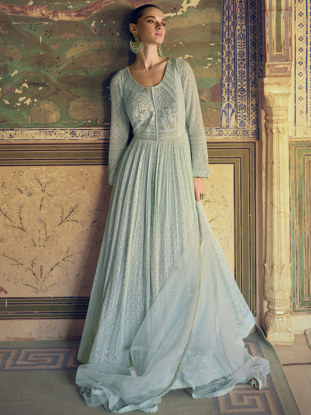 Blue color Gown in Georgette fabric with Embroidered, Thread work
