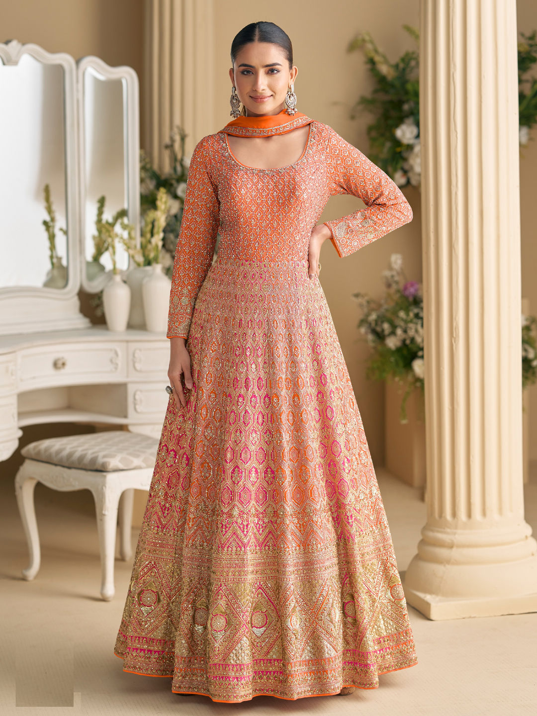 Georgette Festive Gown in Pink and Majenta with Embroidered work