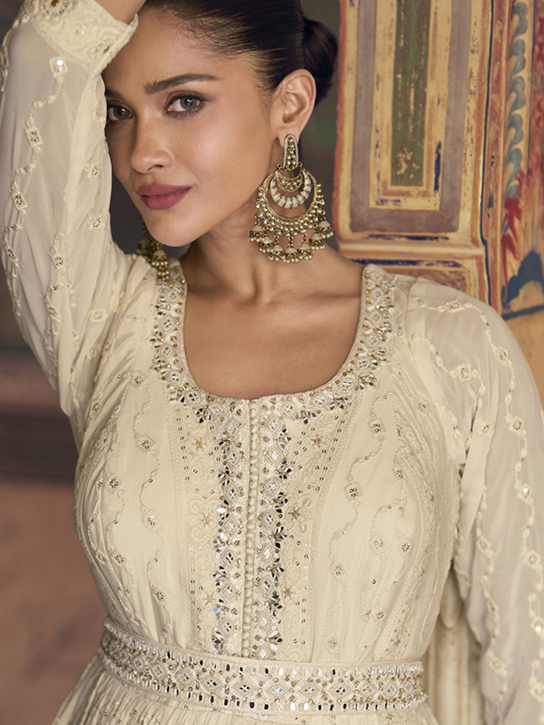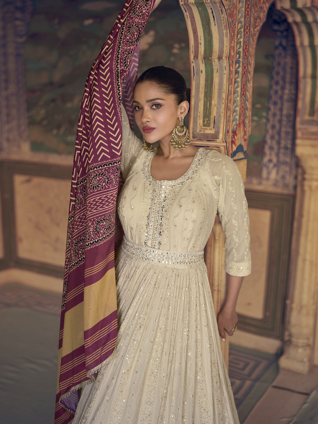 White and Off White color Gown in Georgette fabric with Embroidered, Thread work