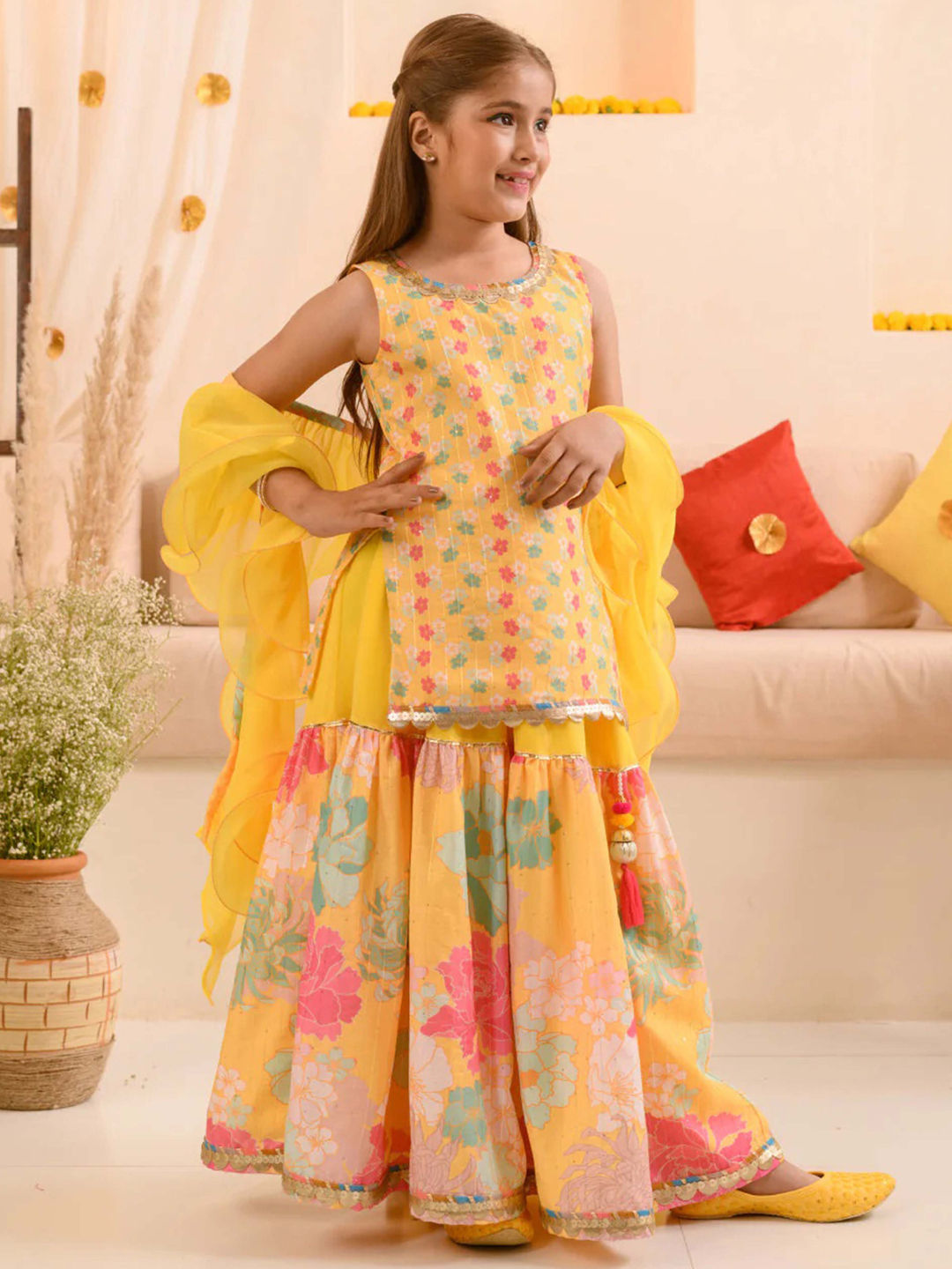 Yellow color Kids Salwar in Georgette fabric with Floral, Lace, Printed work