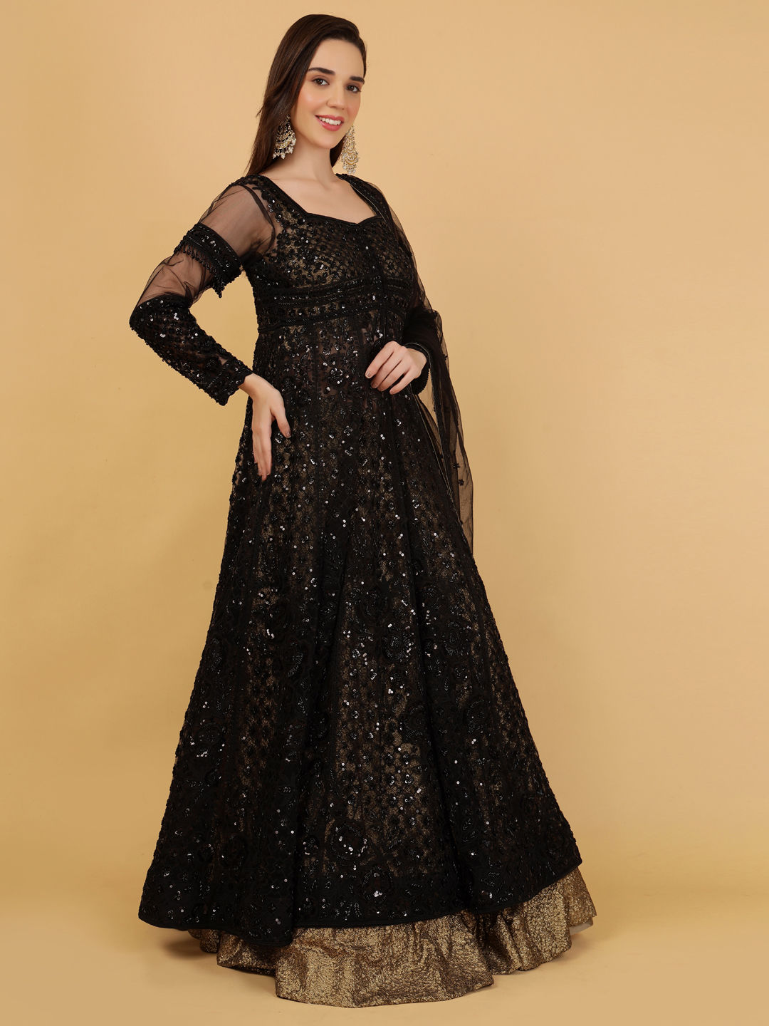 Gold color Long Lehenga Choli in Georgette fabric with Bugle Beads, Stone work