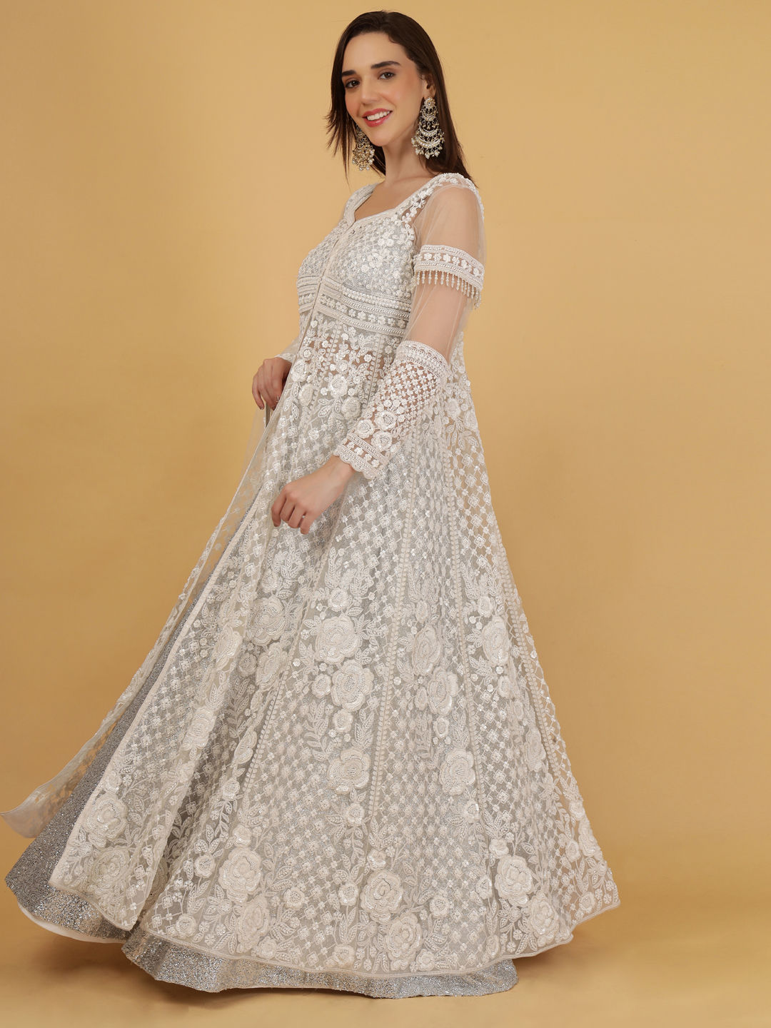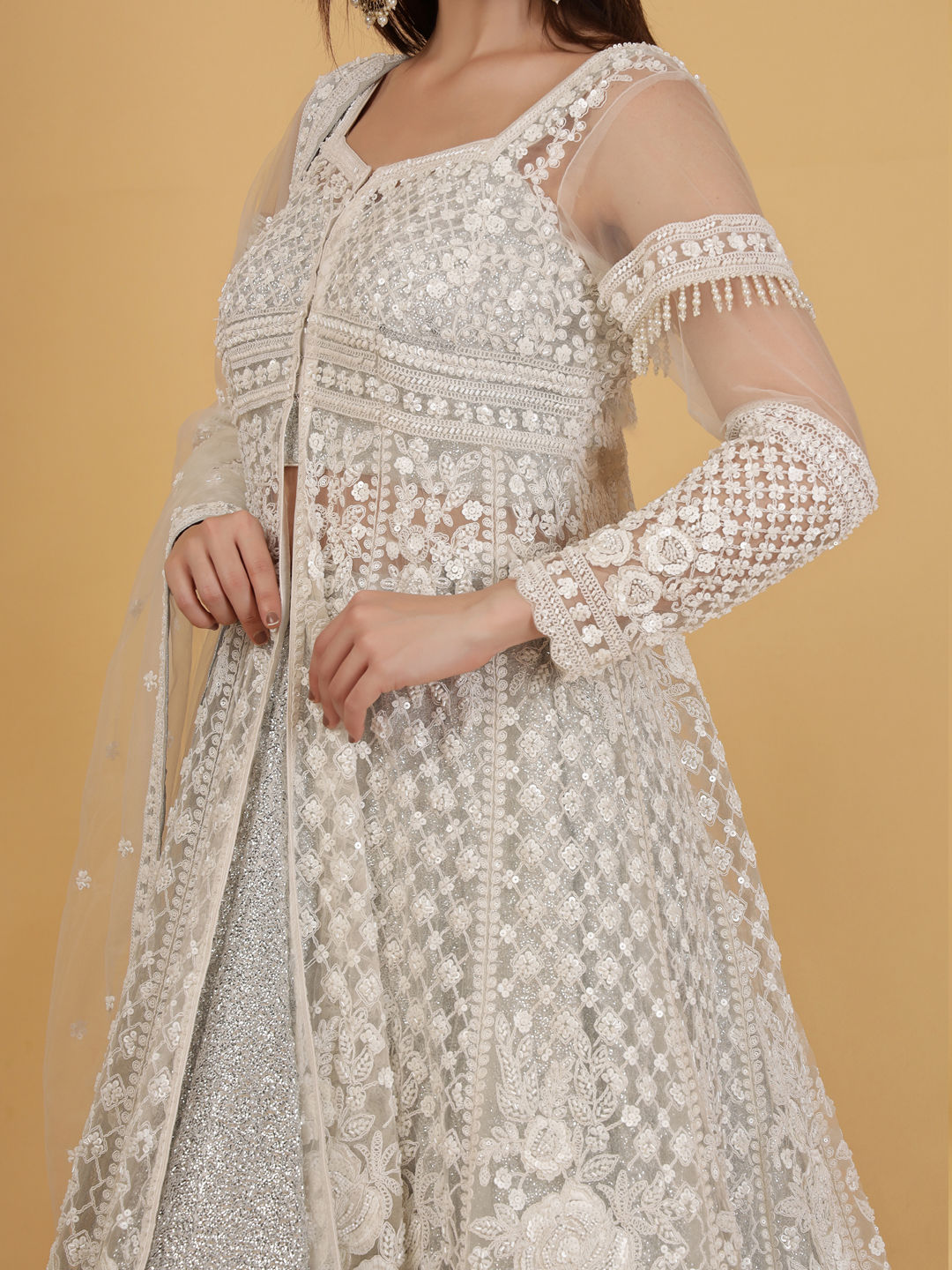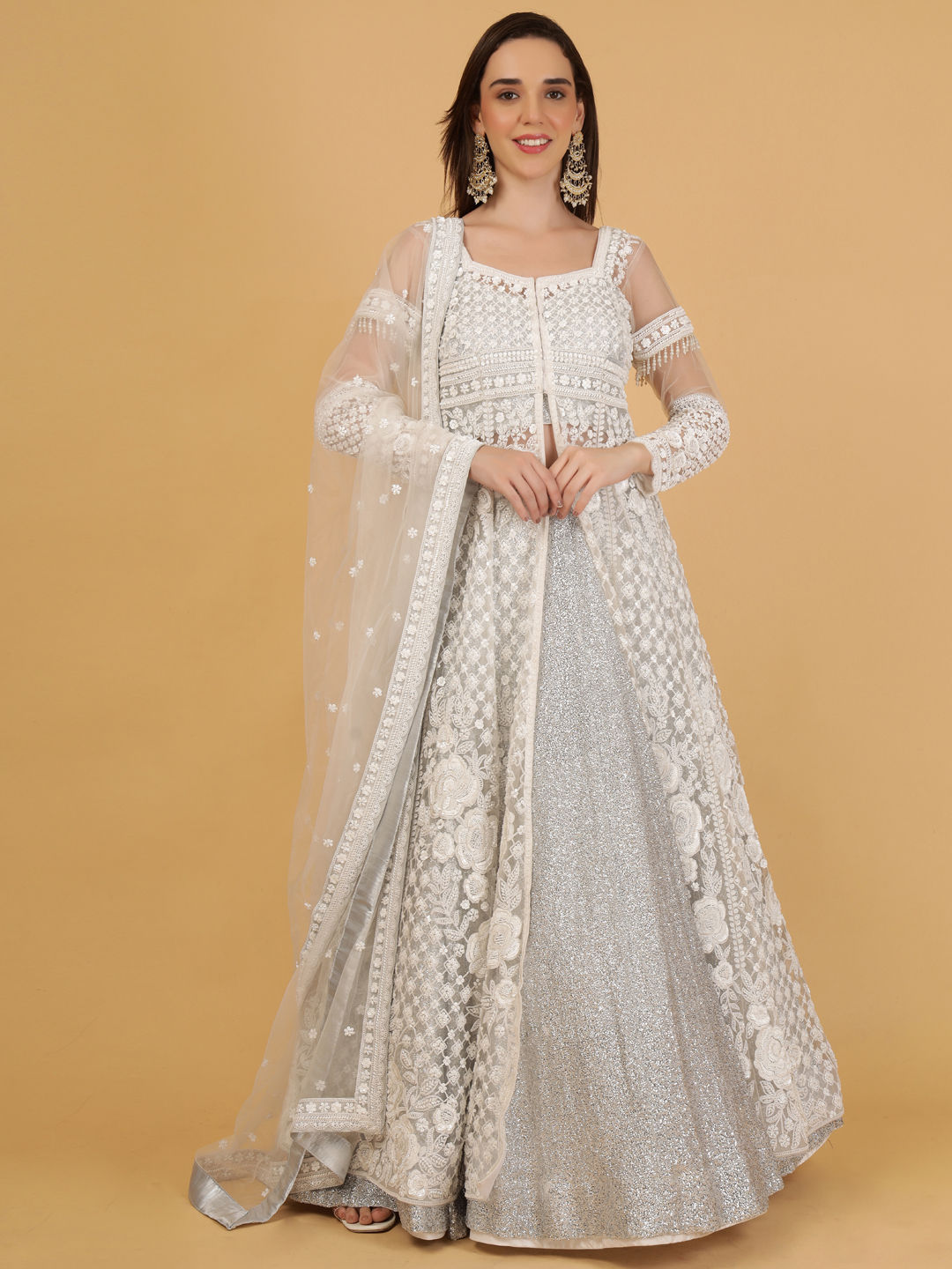 Silver color Long Lehenga Choli in Georgette fabric with Bugle Beads, Stone work