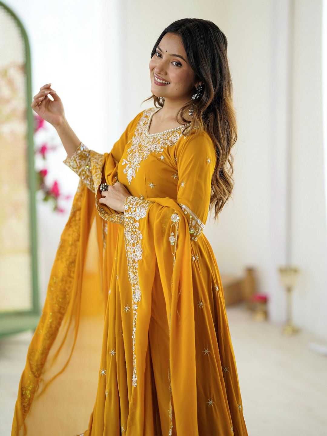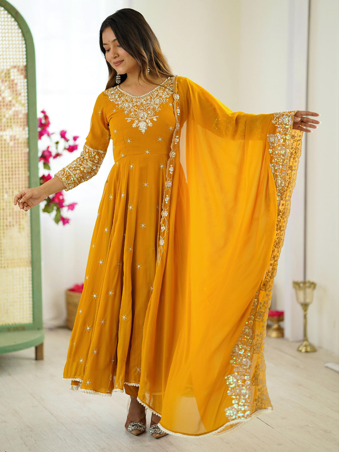 Yellow color Salwar Kameez in Georgette fabric with Embroidered, Moti, Sequence work