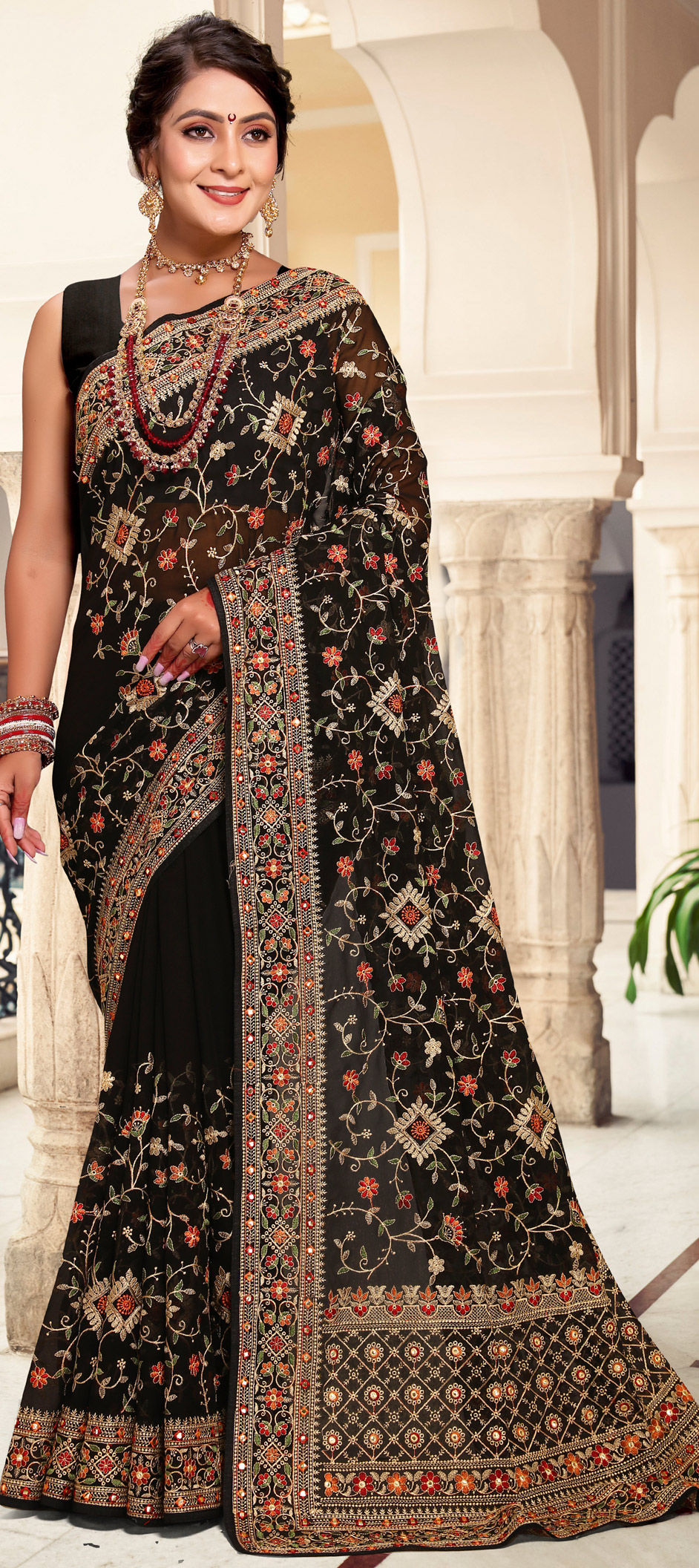 Black and Grey color Saree in Georgette fabric with Embroidered, Resham, Thread work