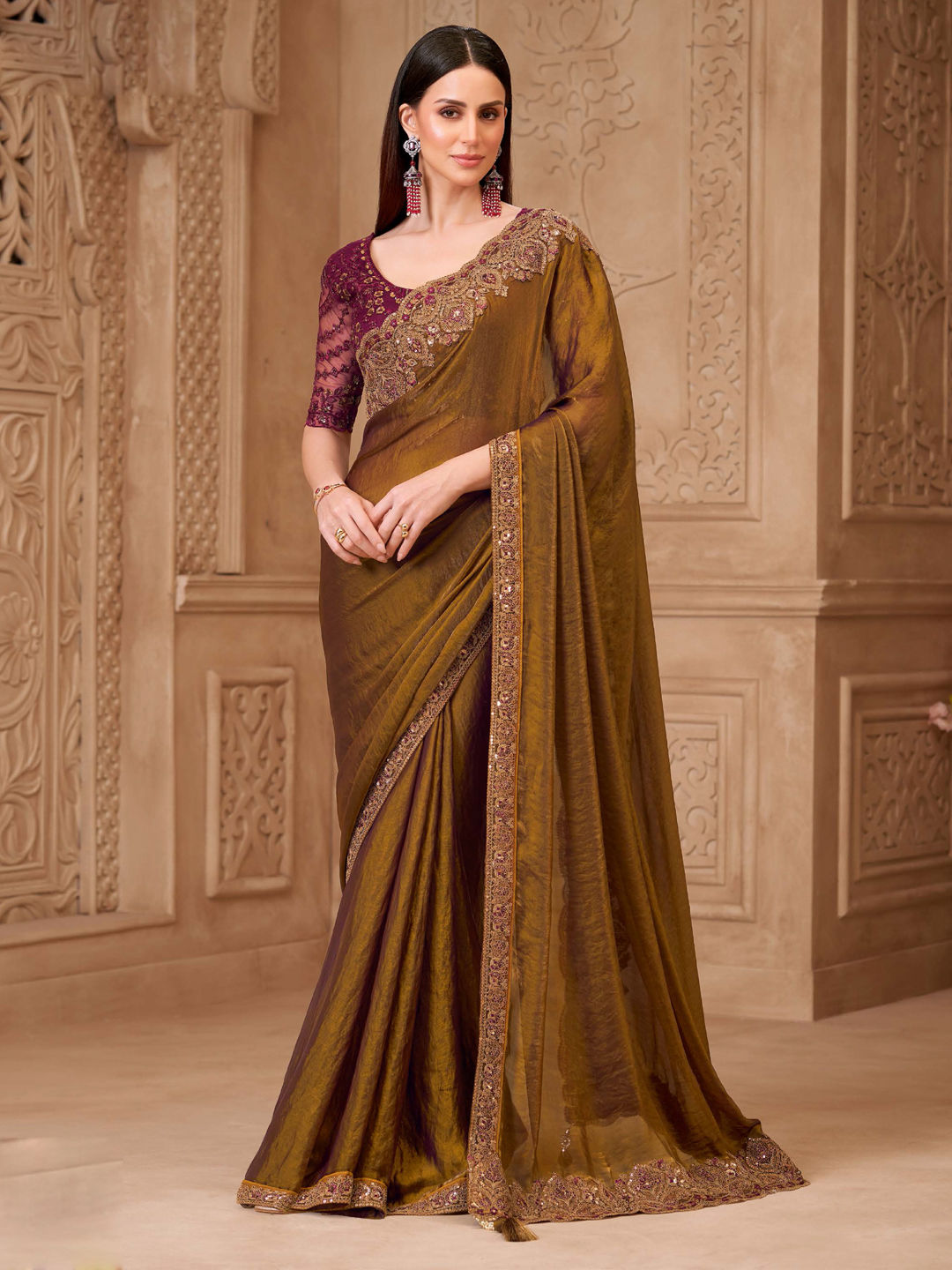 Georgette Festive Saree in Beige and Brown with Weaving work