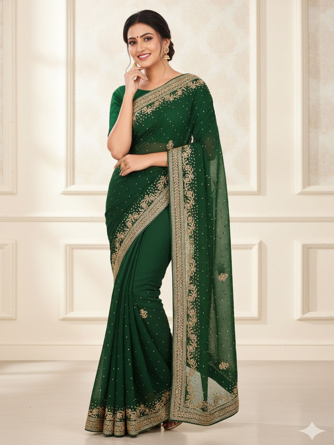 Green color Saree in Georgette fabric with Embroidered, Stone work