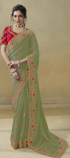 Green color Saree in Georgette fabric with Embroidered, Resham, Stone, Thread work