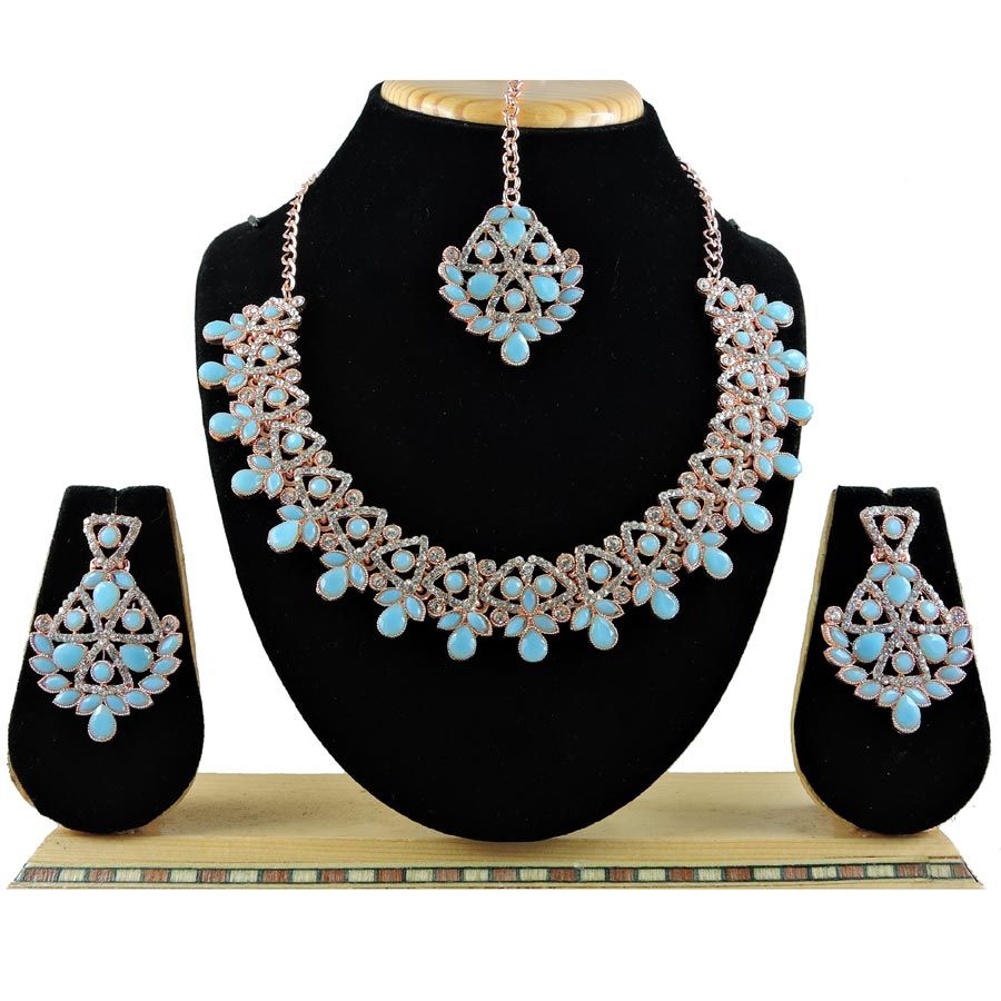 Gold Rodium Polish Blue color Necklace in Metal Alloy studded with Austrian diamond