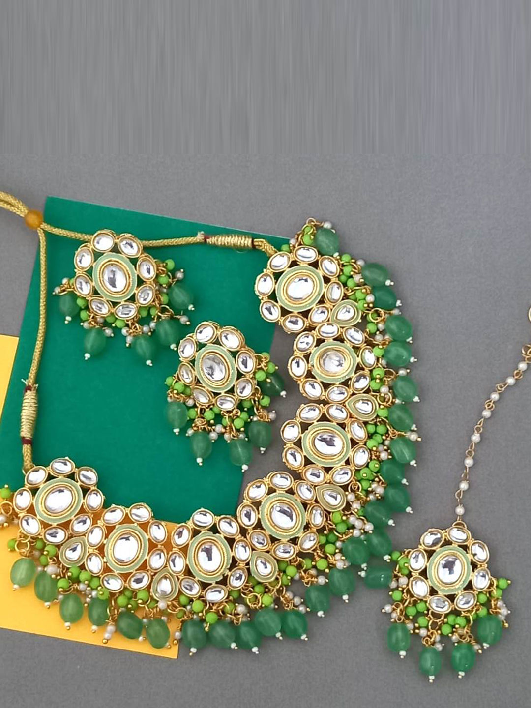 Gold Rodium Polish Green color Necklace in Metal Alloy studded with CZ Diamond, Kundan, Pearl