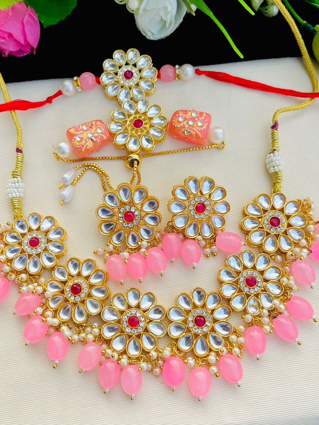 Gold Rodium Polish Pink and Majenta color Necklace in Metal Alloy studded with CZ Diamond, Kundan, Pearl