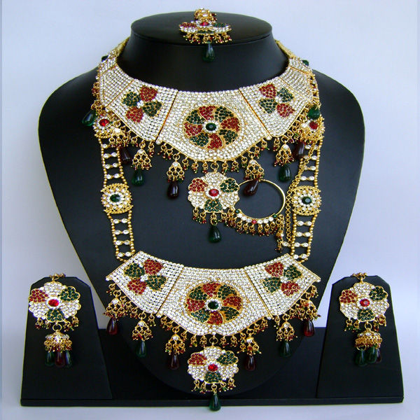 Gold Rodium Polish Green, Red and Maroon color Bridal Jewelry in Metal Alloy studded with Cubic Zirconia, Kundan