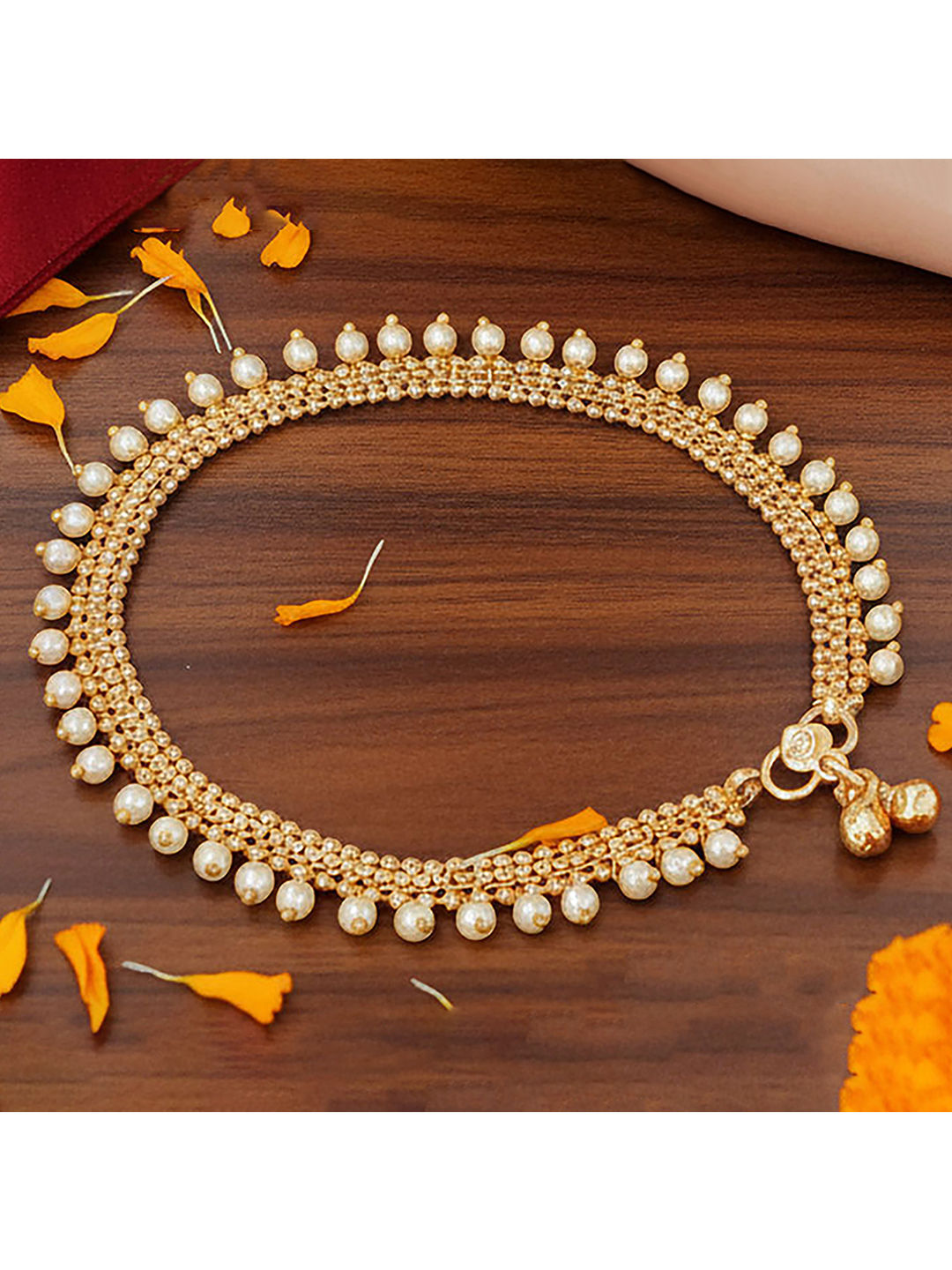 Gold Rodium Polish White and Off White color Anklet in Metal Alloy studded with Pearl