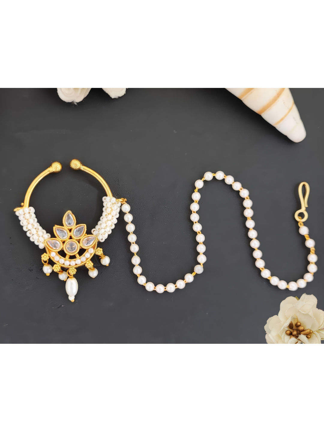 Gold Rodium Polish White and Off White color Nose Ring in Metal Alloy studded with Pearl