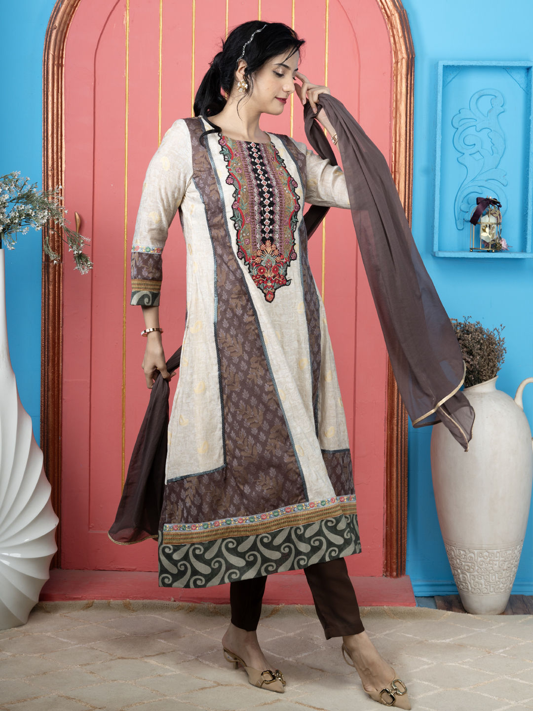Beige and Brown color Salwar Kameez in Handloom fabric with Embroidered, Thread work