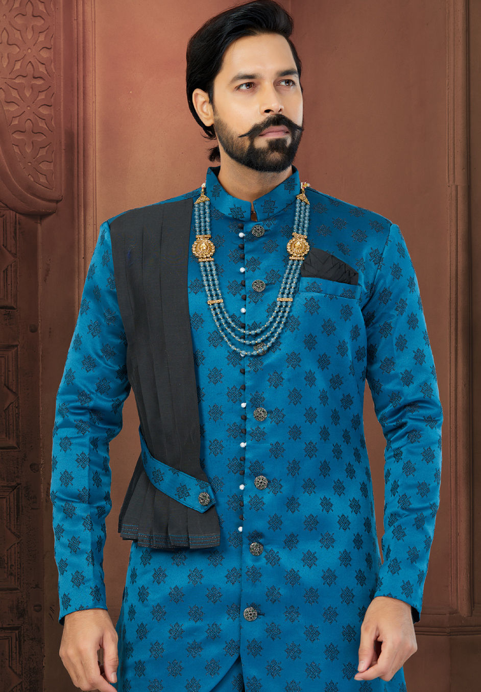 Jacquard Party Wear IndoWestern Dress in Blue with Thread work