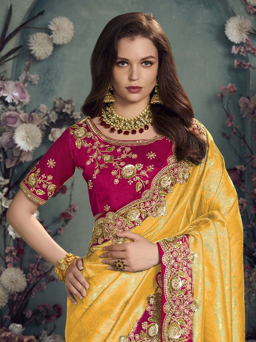 Yellow color Saree in Jacquard fabric with Sequence, Thread work