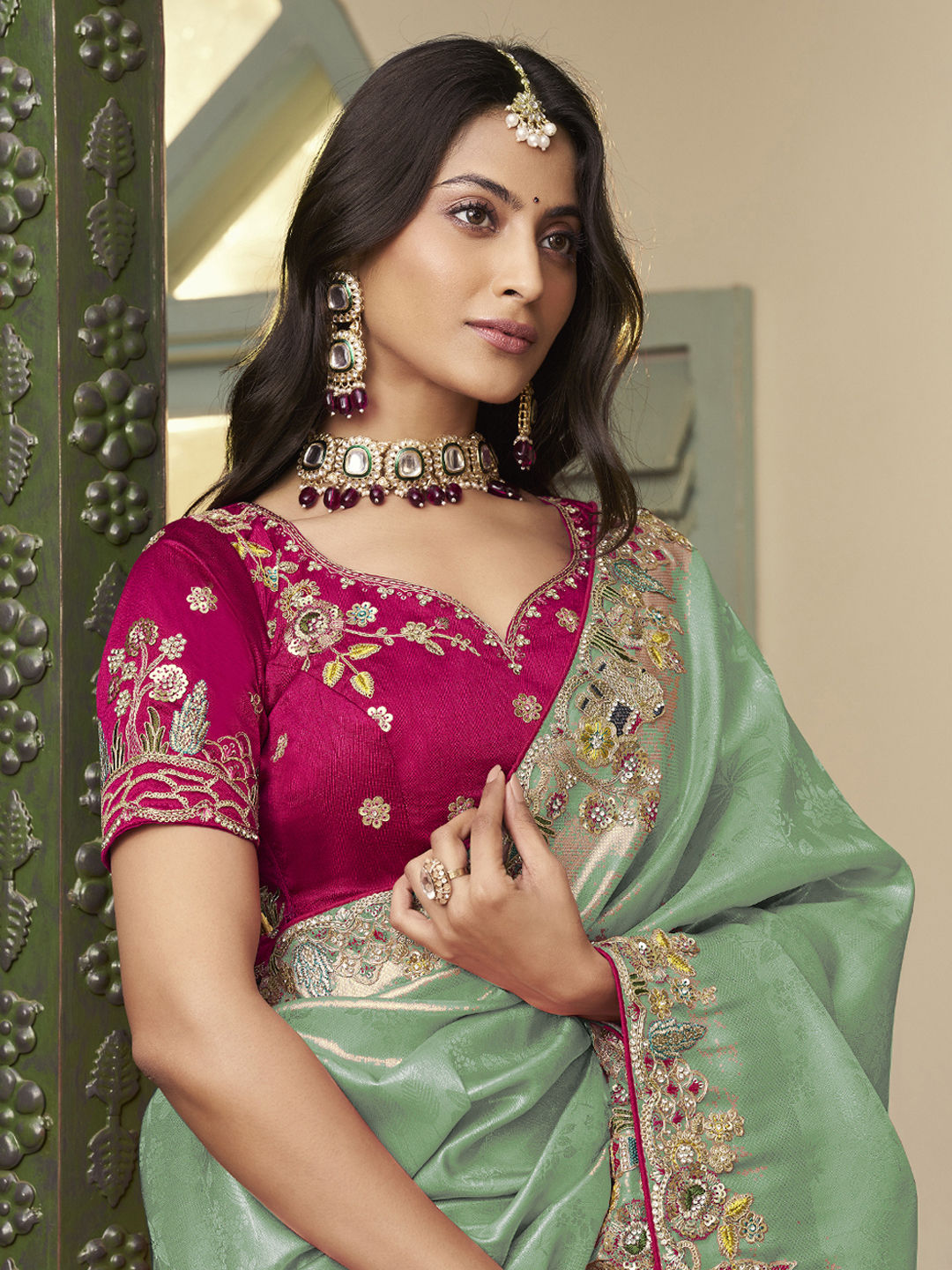 Green color Saree in Jacquard fabric with Bugle Beads, Embroidered, Sequence, Thread work