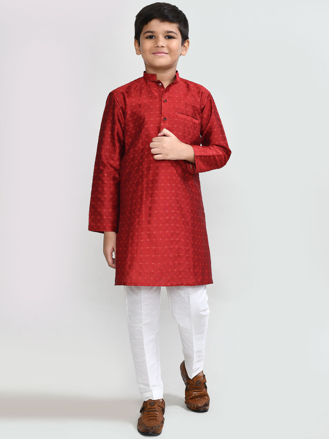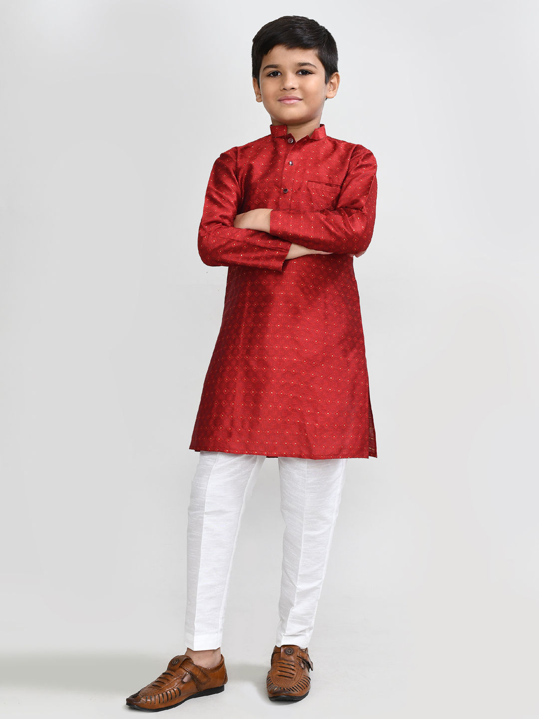 Red and Maroon color Boys Kurta Pyjama in Jacquard fabric with Weaving work
