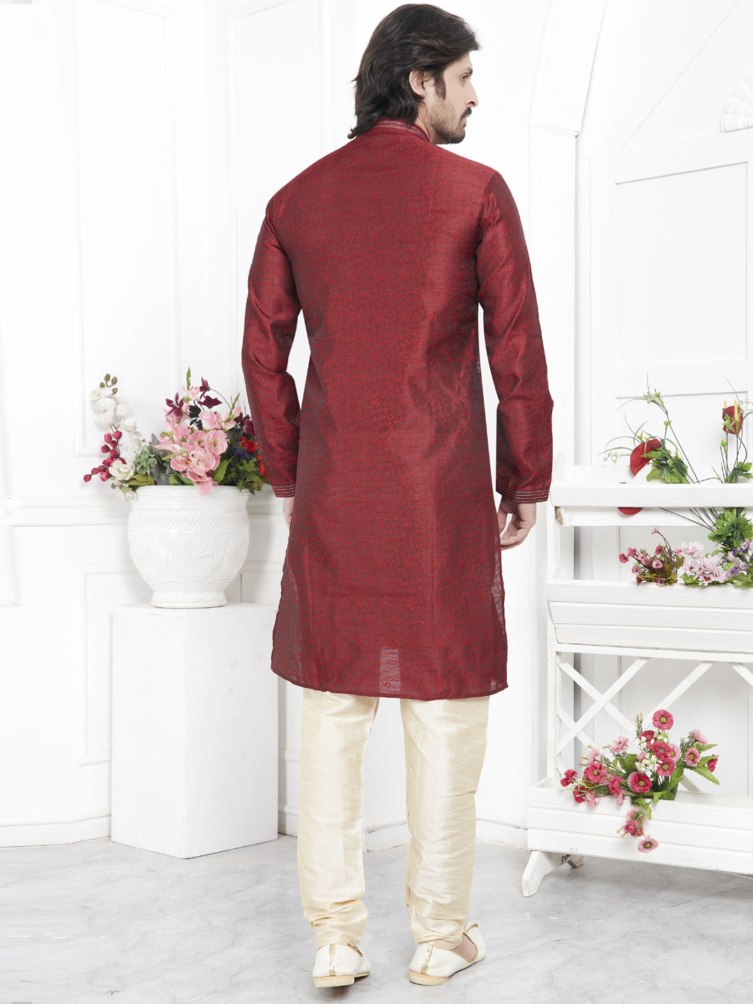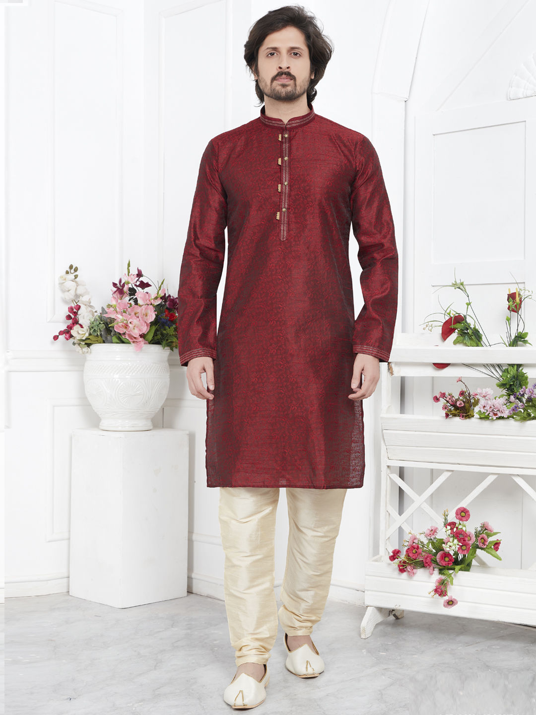 Red and Maroon color Kurta Pyjamas in Jacquard fabric with Weaving work
