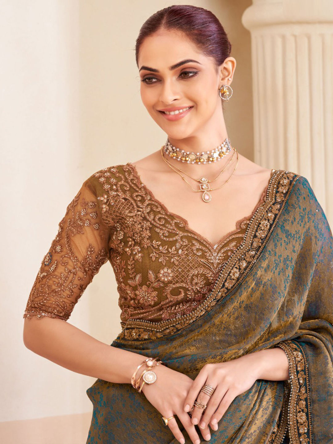 in Beige and Brown with Embroidered work