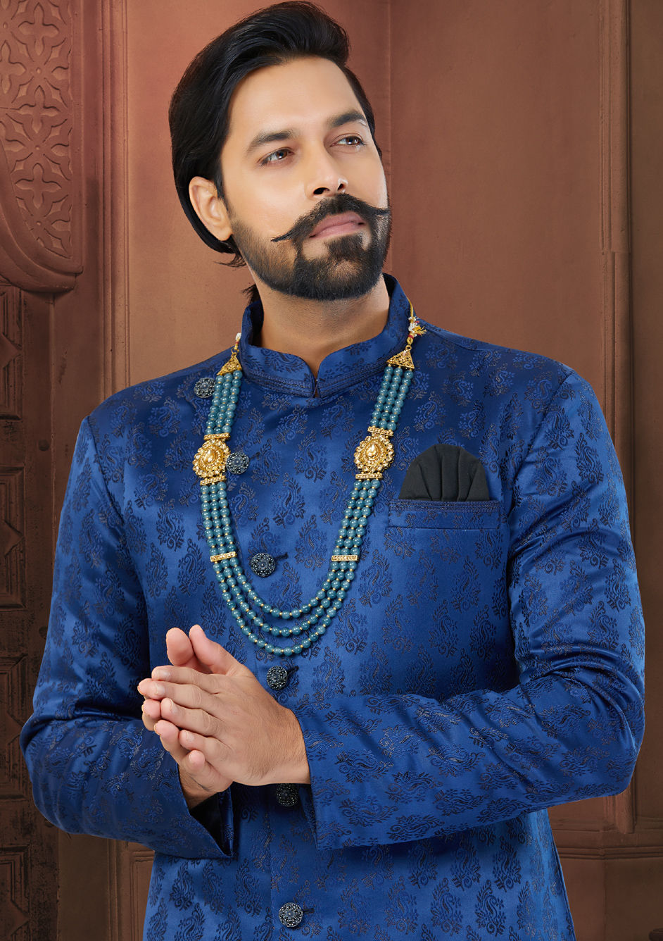 Jacquard Party Wear IndoWestern Dress in Blue with Thread work