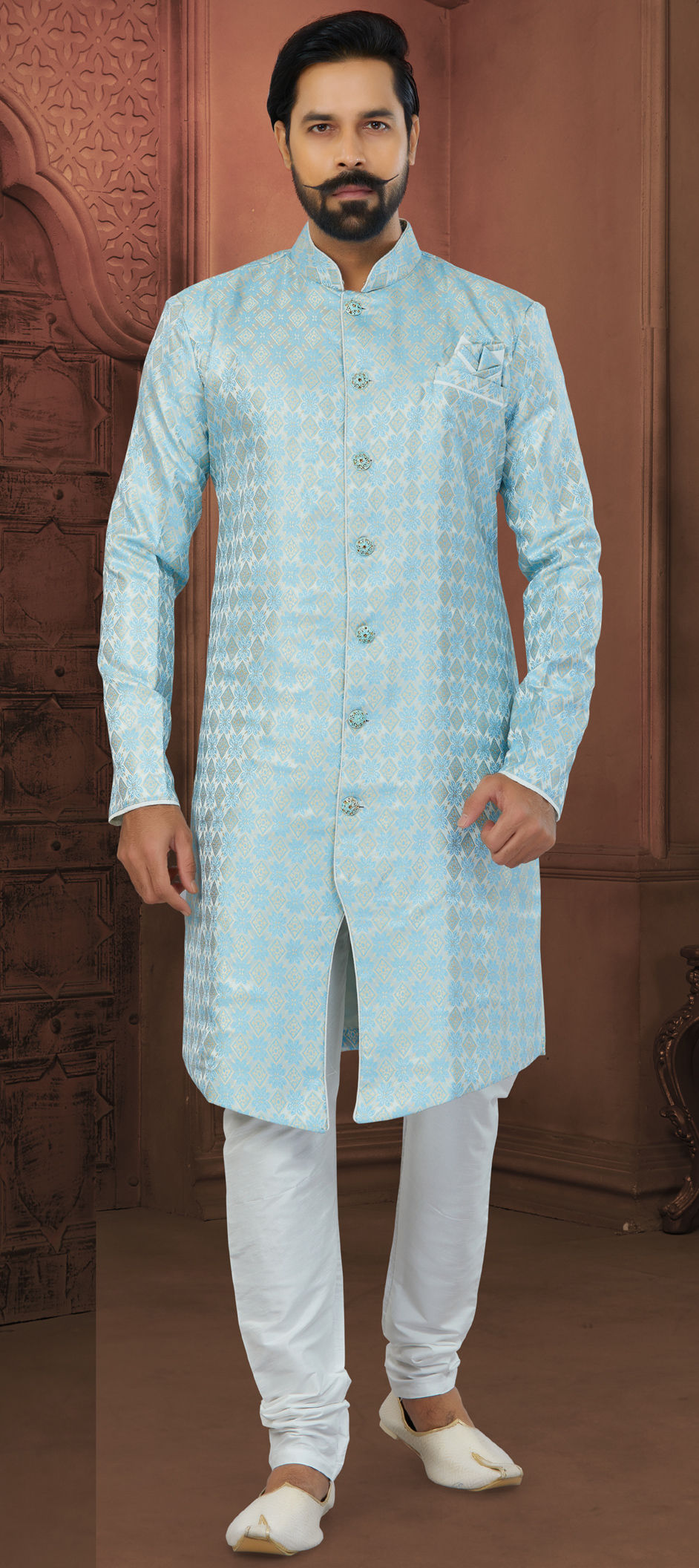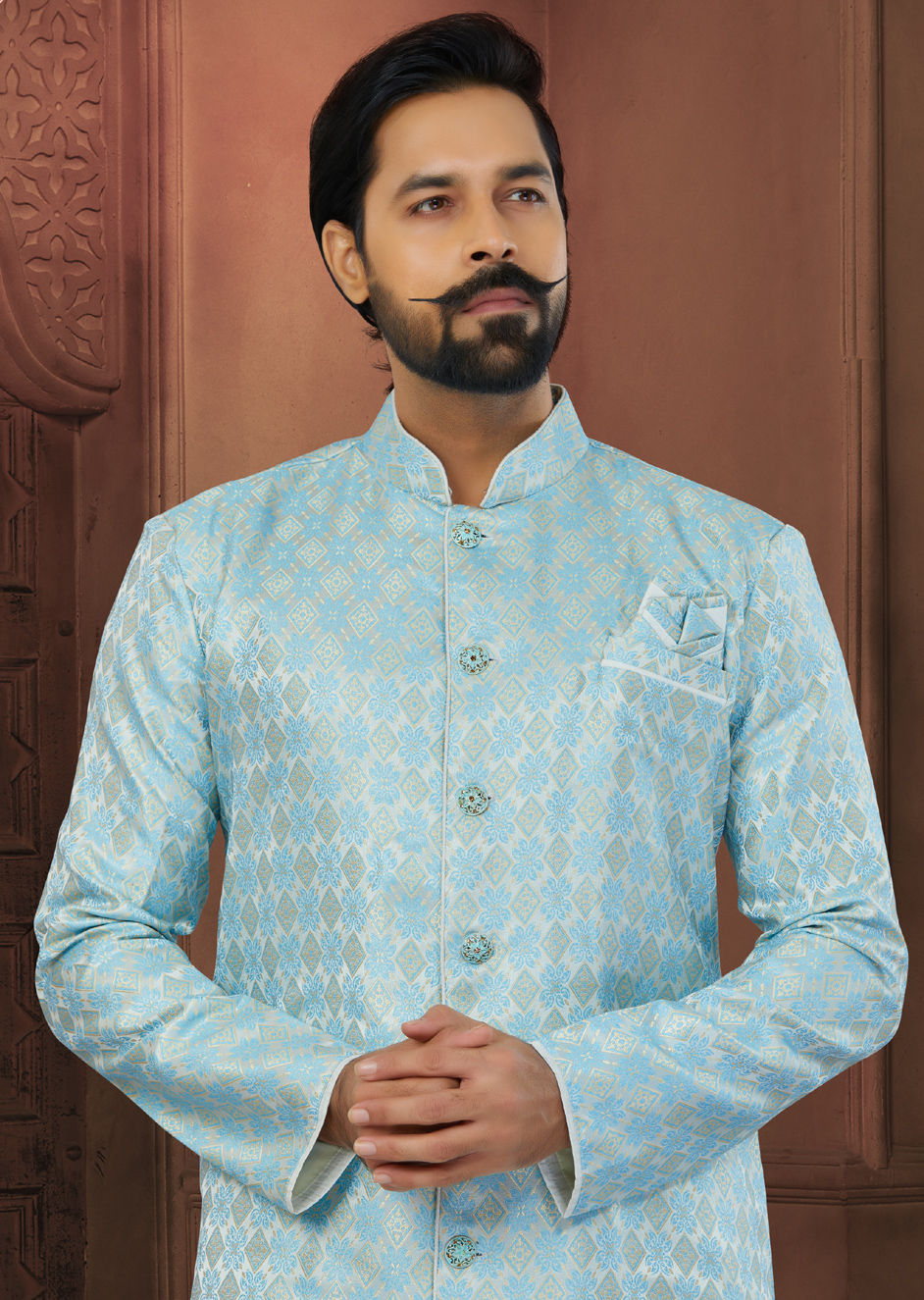 Jacquard Party Wear IndoWestern Dress in Blue with Thread work