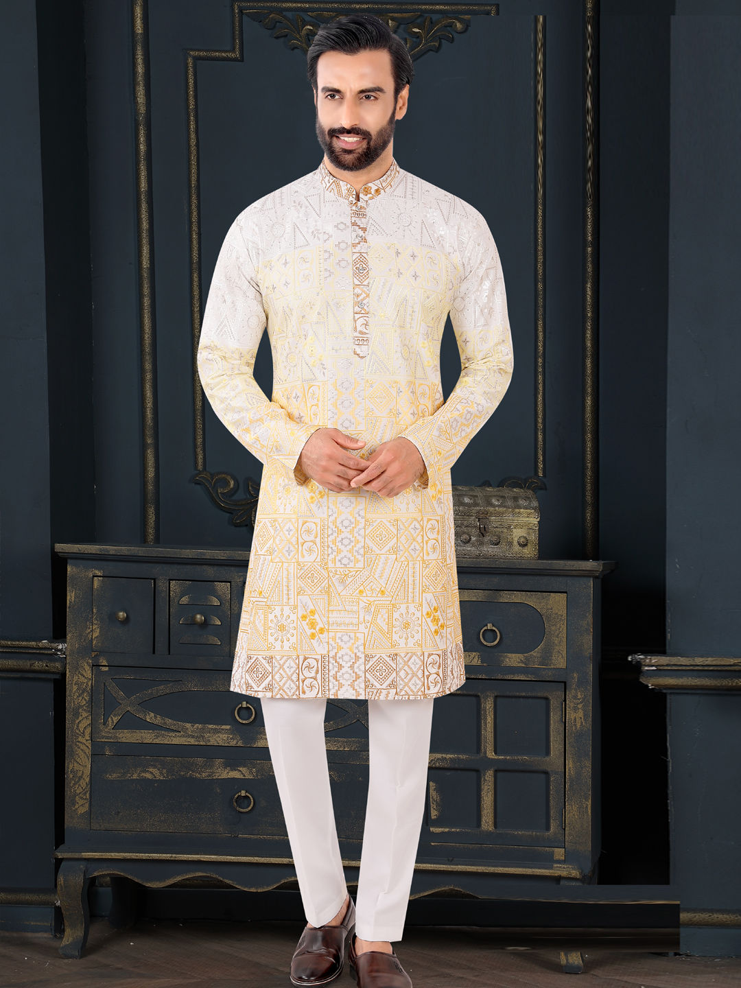Yellow color Kurta Pyjamas in Jacquard fabric with Embroidered work