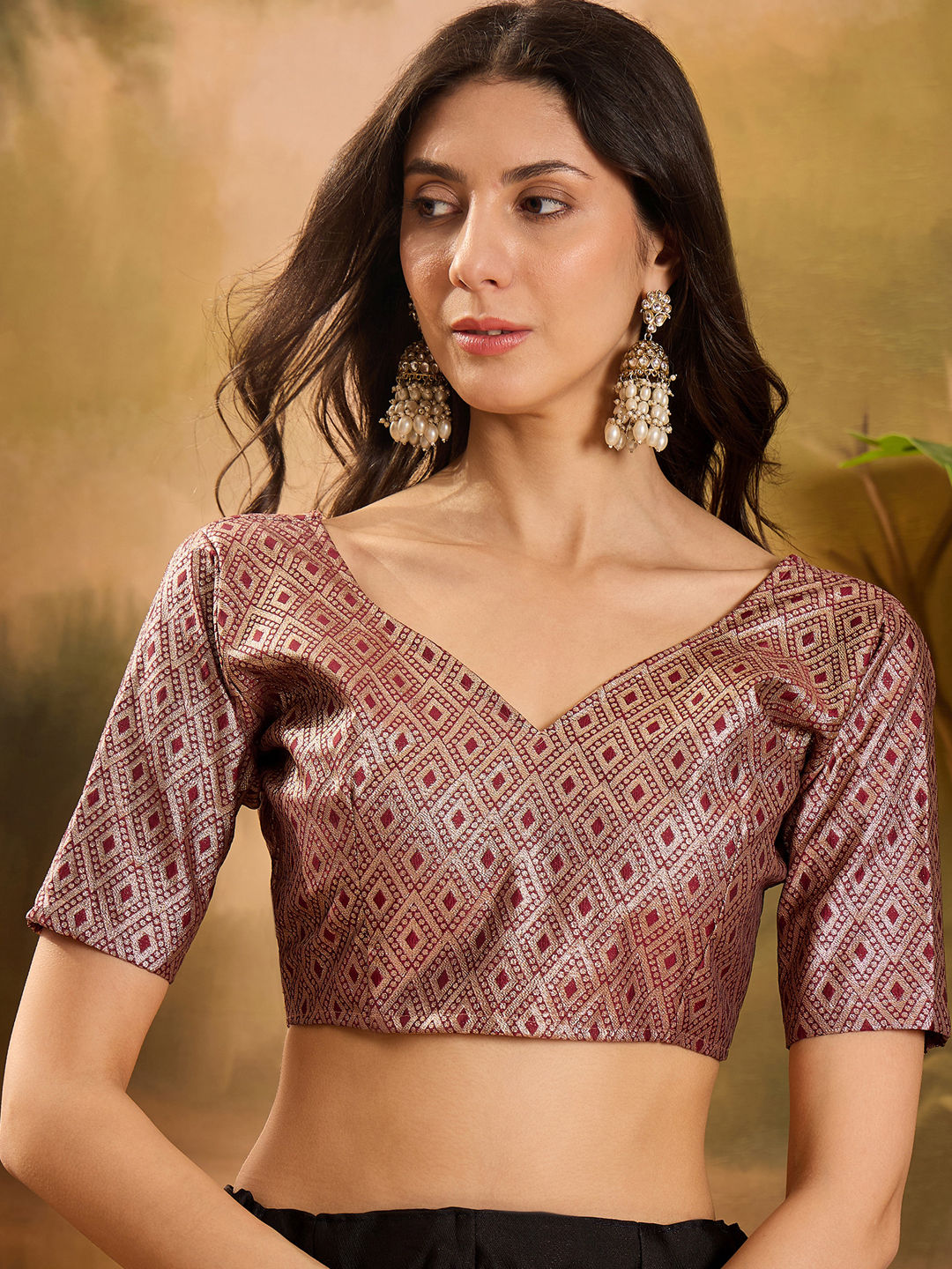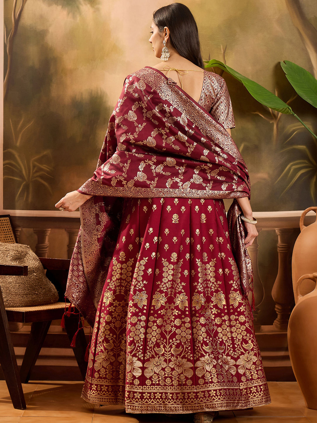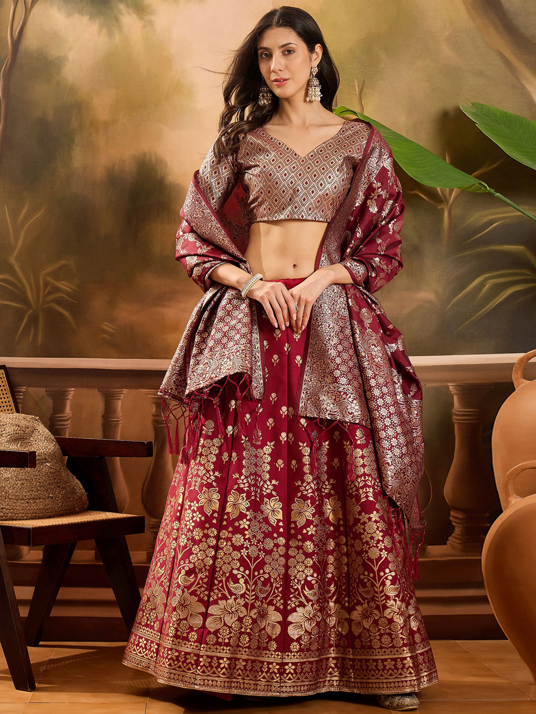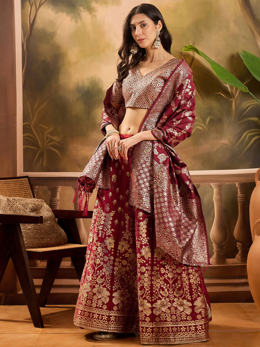Red and Maroon color Lehenga in Banarasi Silk, Jacquard fabric with Weaving work