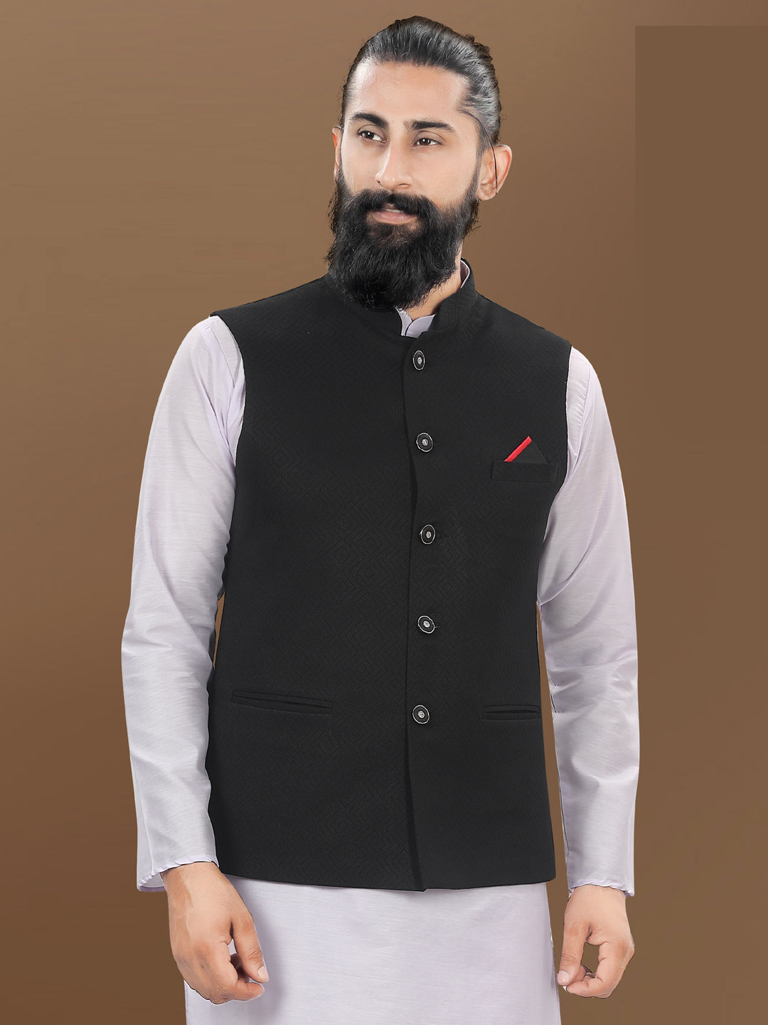 Black and Grey color Nehru Jacket in Jacquard fabric with Weaving work