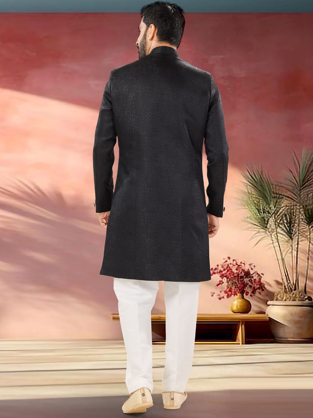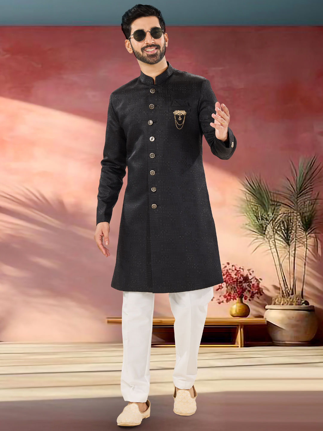 Black and Grey color IndoWestern Dress in Jacquard fabric with Broches, Weaving work