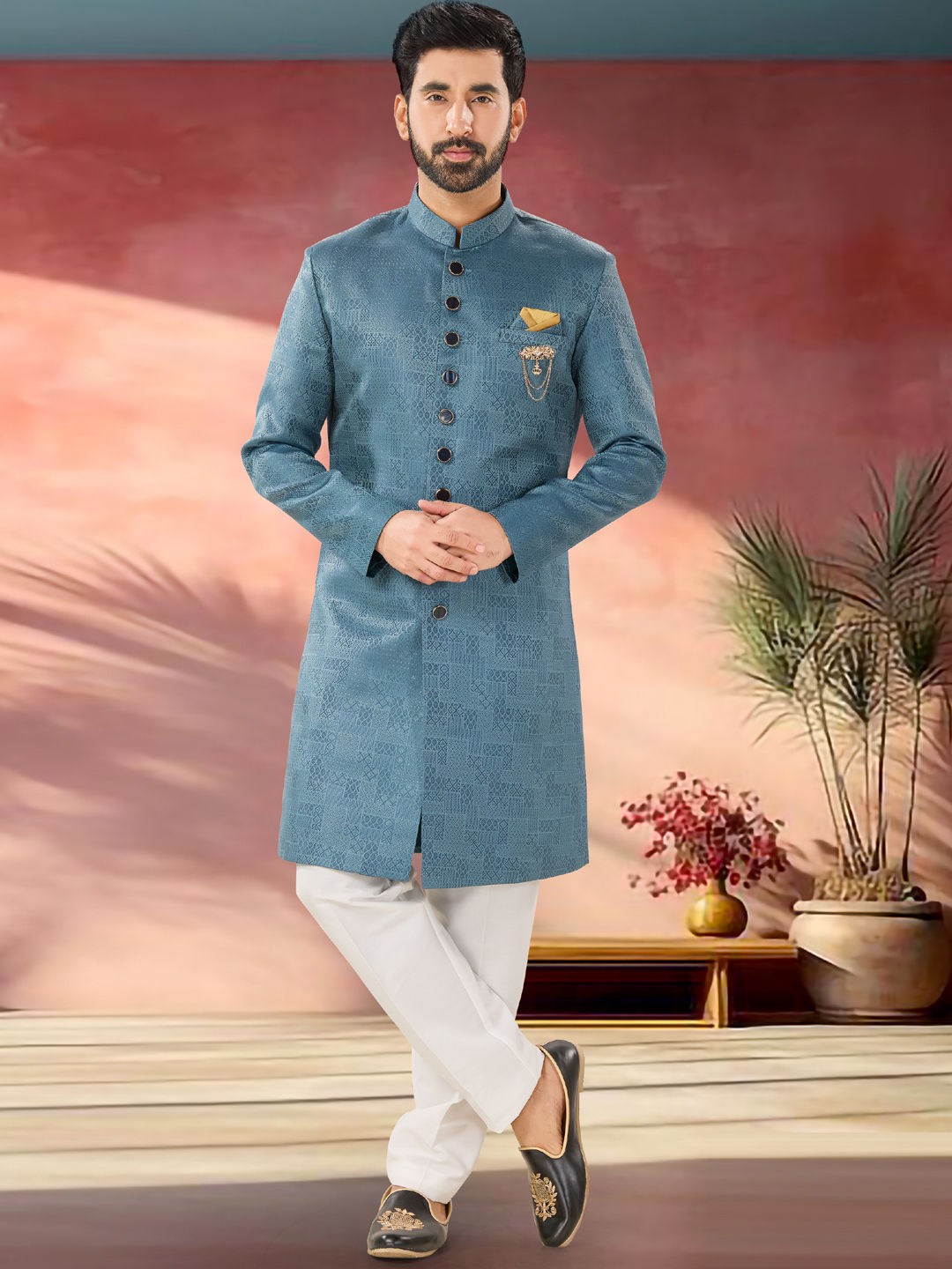 Blue color IndoWestern Dress in Jacquard fabric with Broches, Embroidered, Sequence, Thread work
