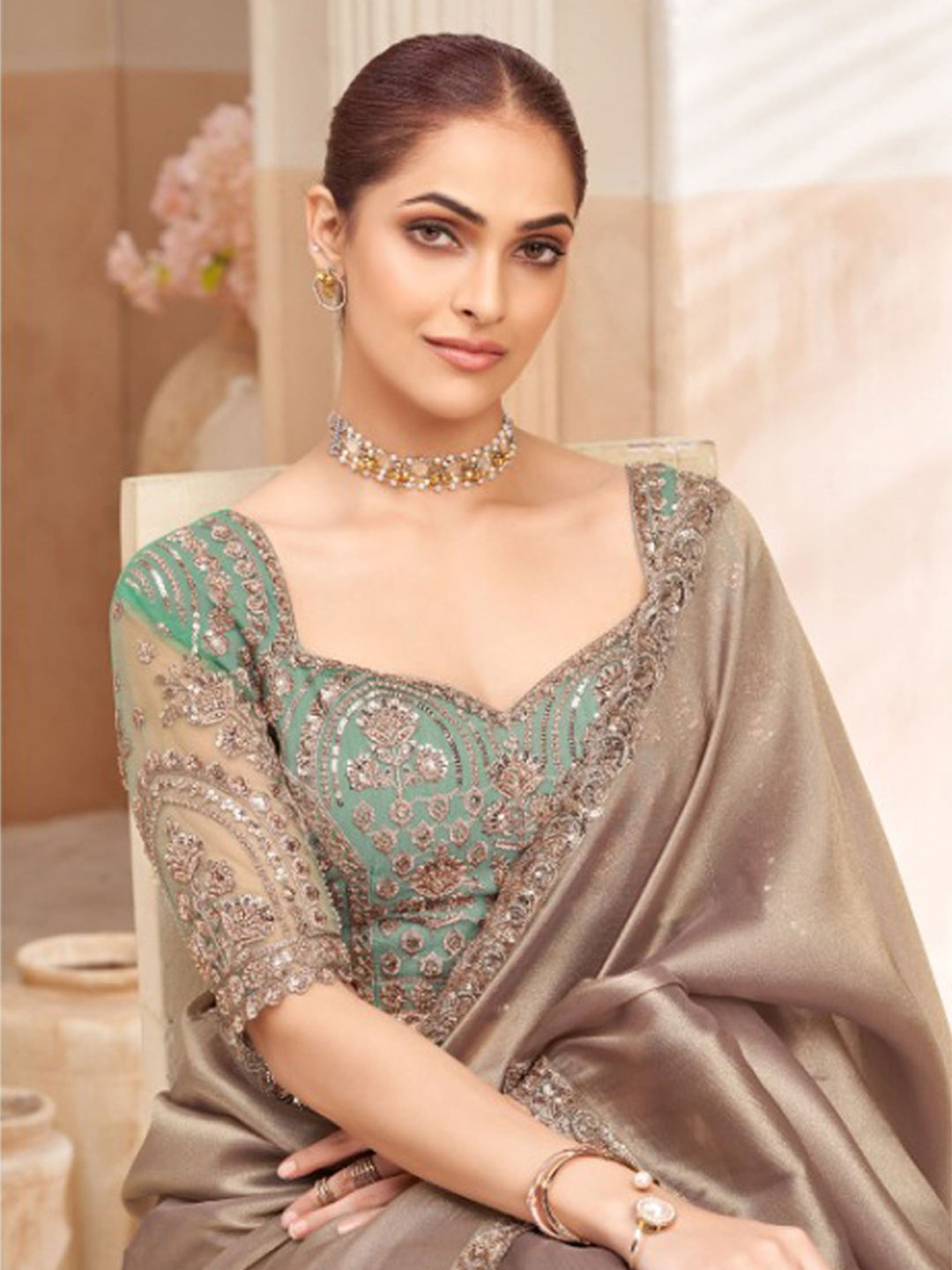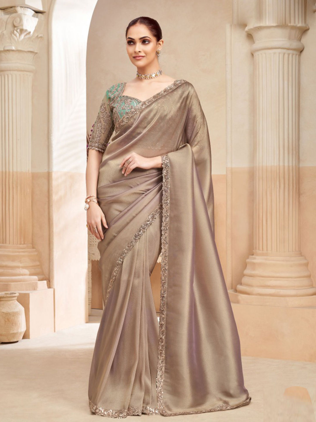 Beige and Brown color Saree in Jacquard fabric with Embroidered, Lace, Sequence work