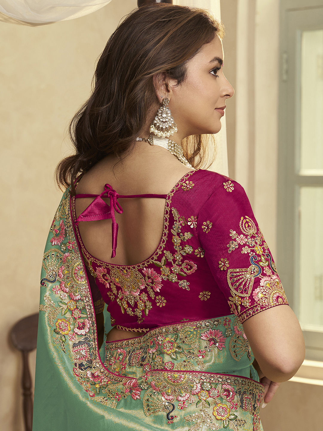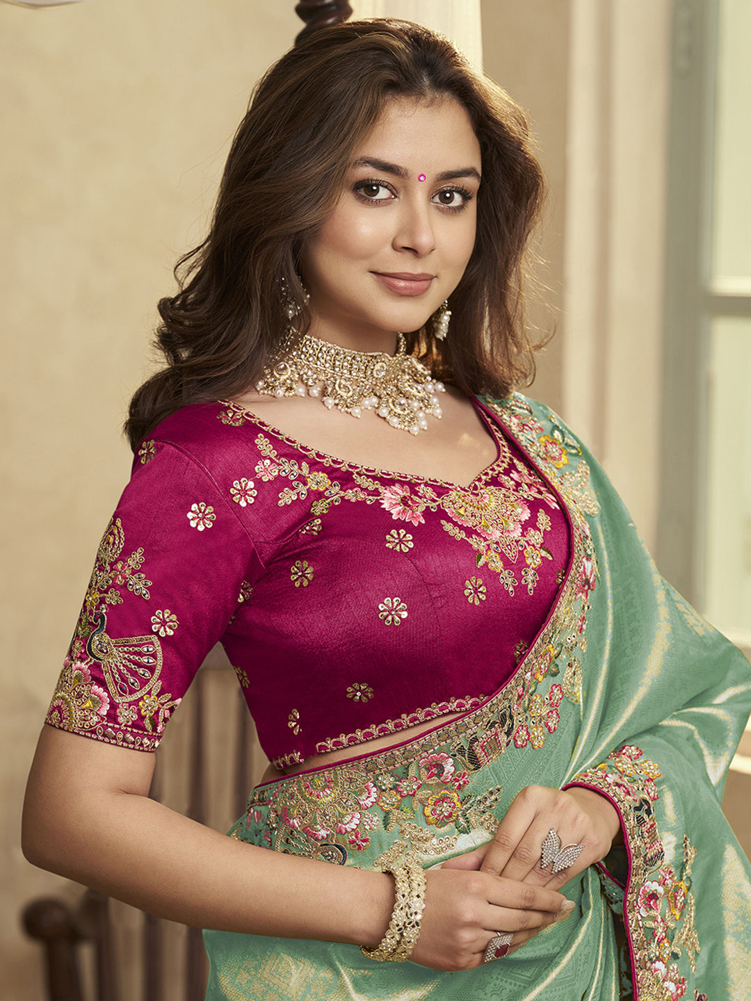 Green color Saree in Jacquard fabric with Embroidered, Sequence, Stone, Thread, Weaving, Zari work
