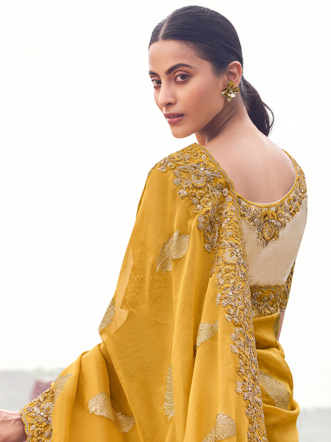 Yellow color Saree in Jacquard, Tissue fabric with Embroidered, Resham, Sequence, Weaving, Zari work