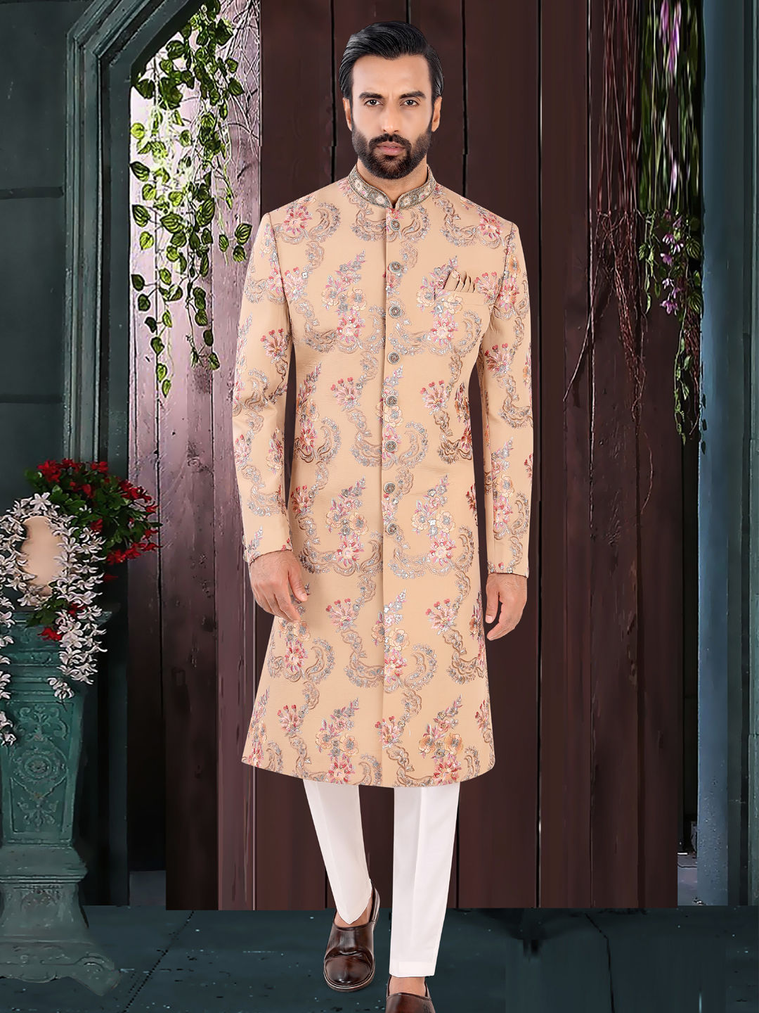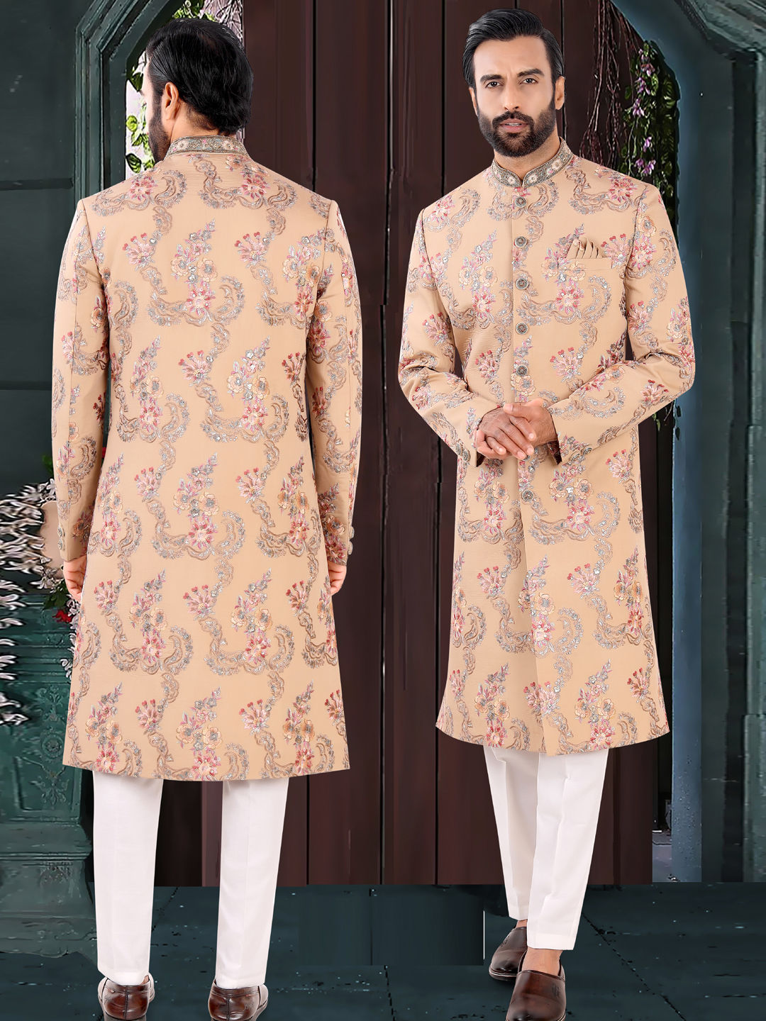 Beige and Brown color Sherwani in Jacquard fabric with Embroidered, Sequence, Thread work