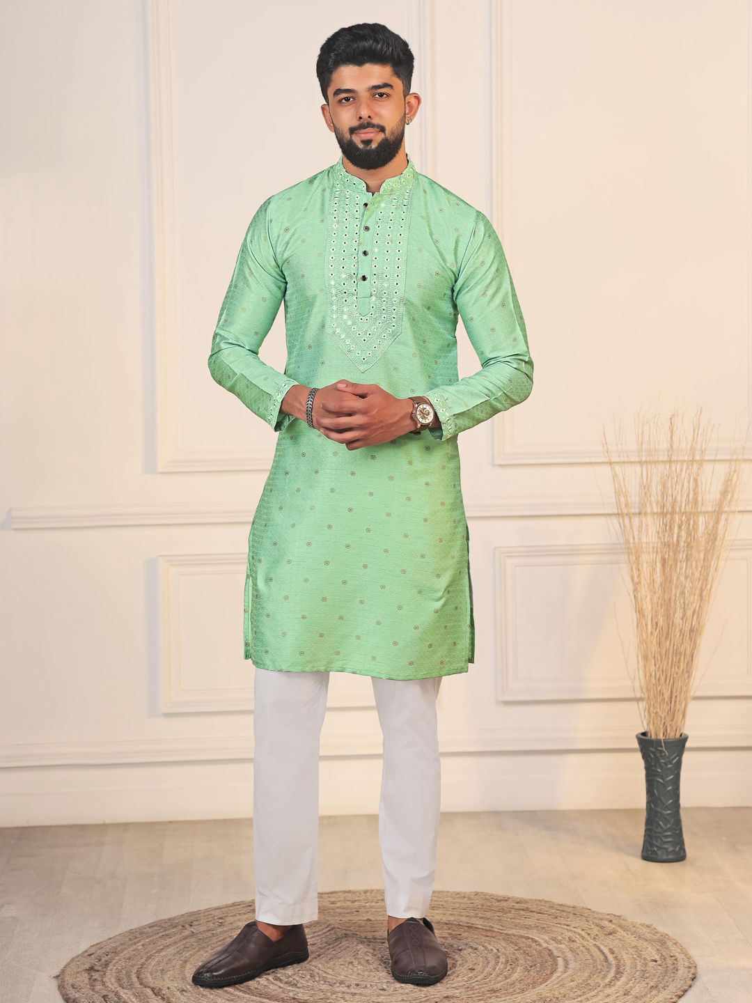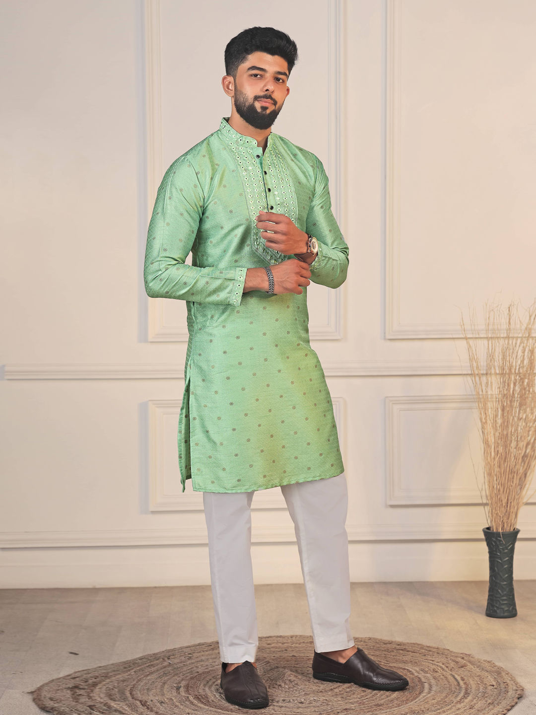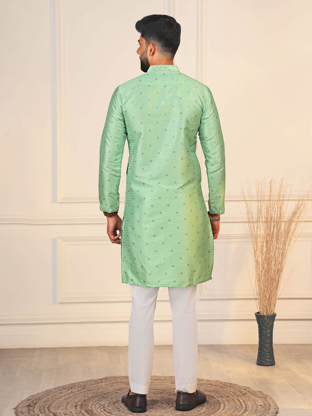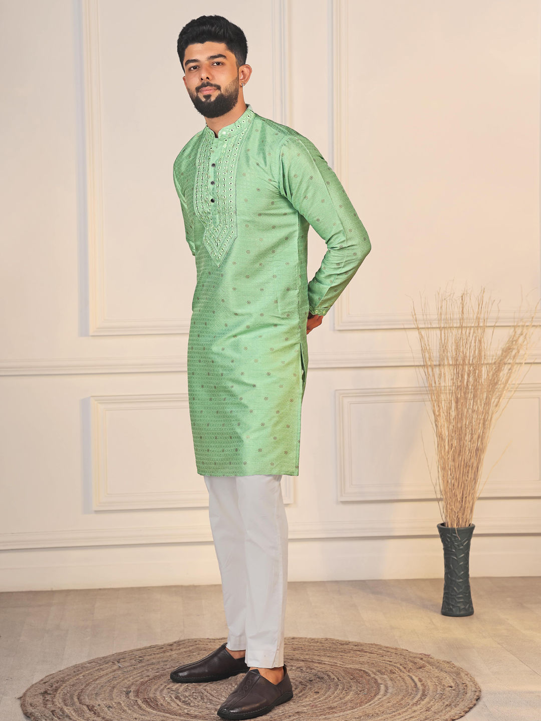 Green color Kurta Pyjamas in Jacquard fabric with Embroidered, Thread work