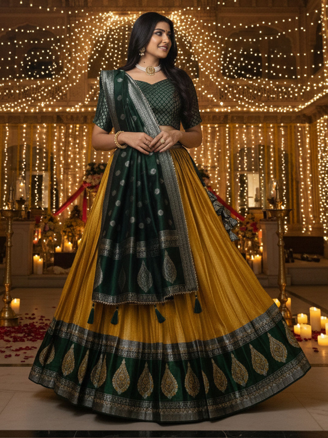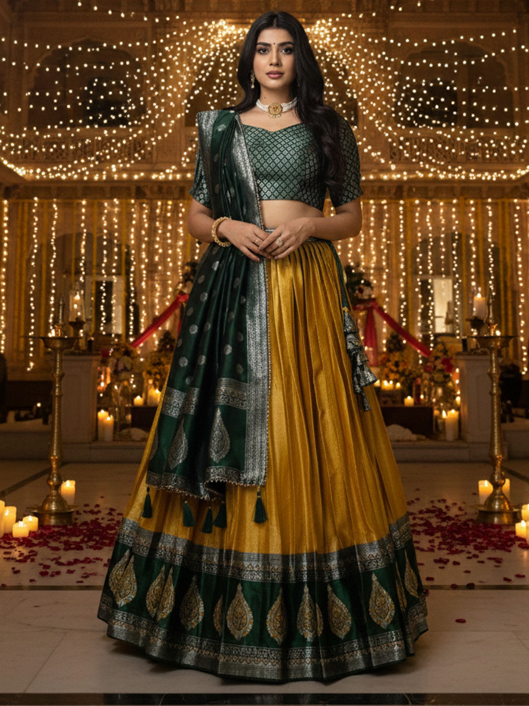 Kanchipuram Silk Party Wear Lehenga in Gold with Zari work