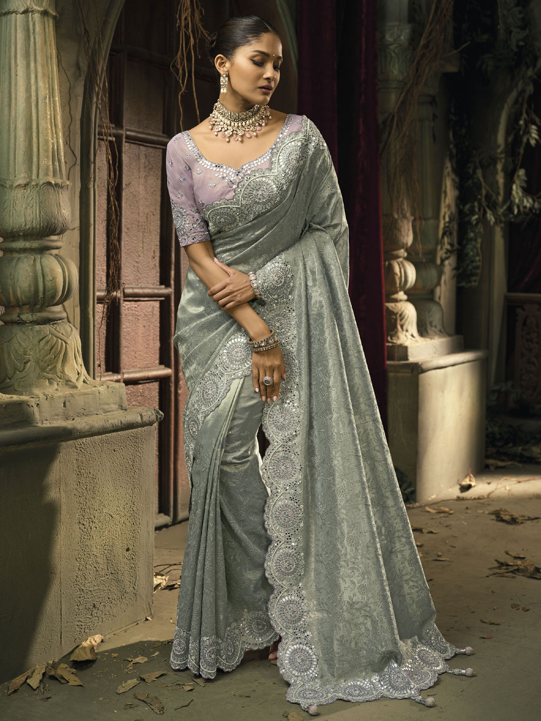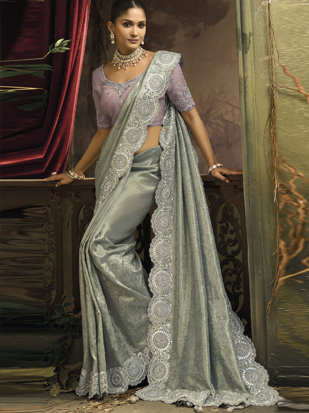 Description: Black and Grey color Saree in Kanchipuram Silk fabric with Border, Cut Dana, Embroidered, Mirror, Moti, Thread, Zari work