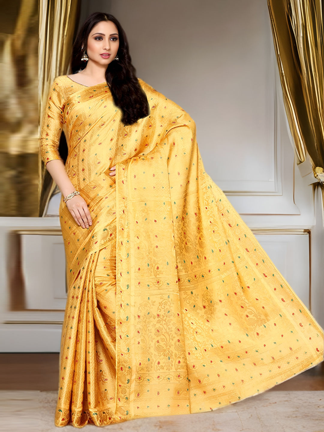 Gold color Saree in Kanjeevaram Silk fabric with Weaving, Zari, Zircon work