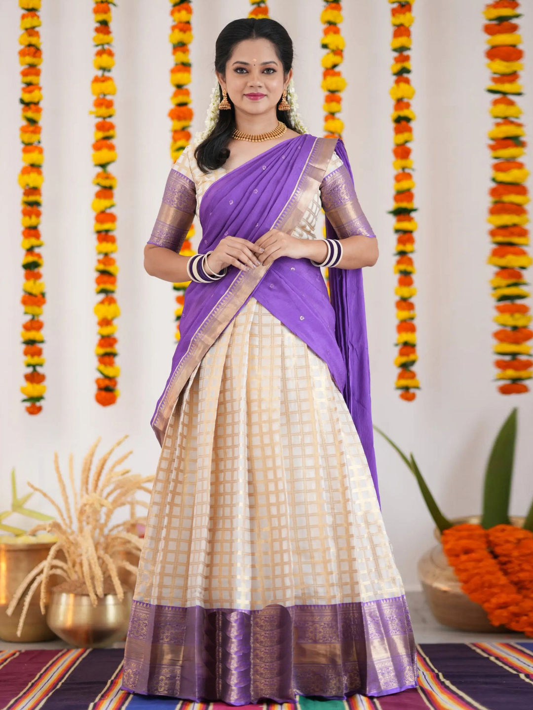 White and Off White color Lehenga in Kanjeevaram Silk fabric with Weaving, Zari work