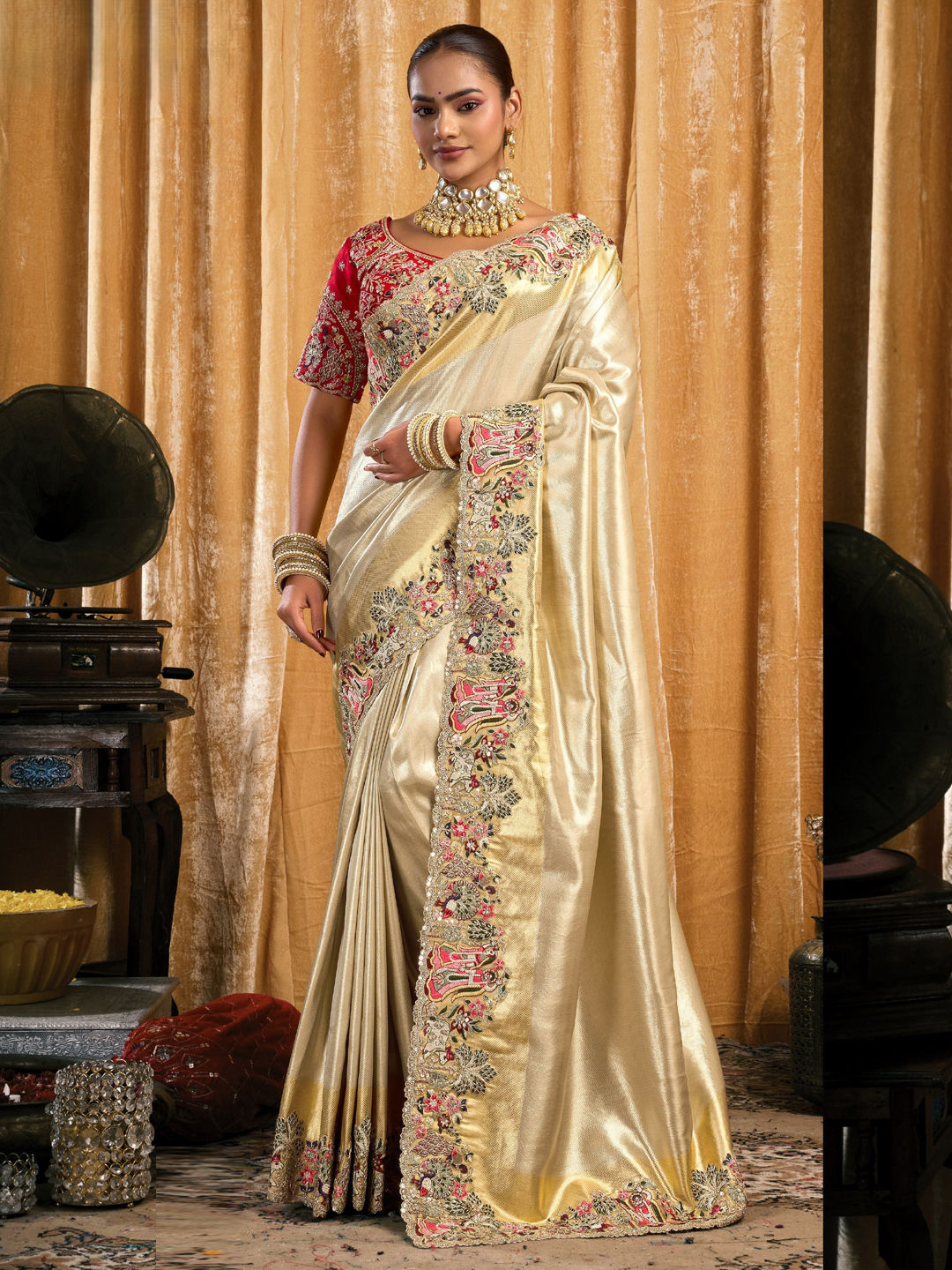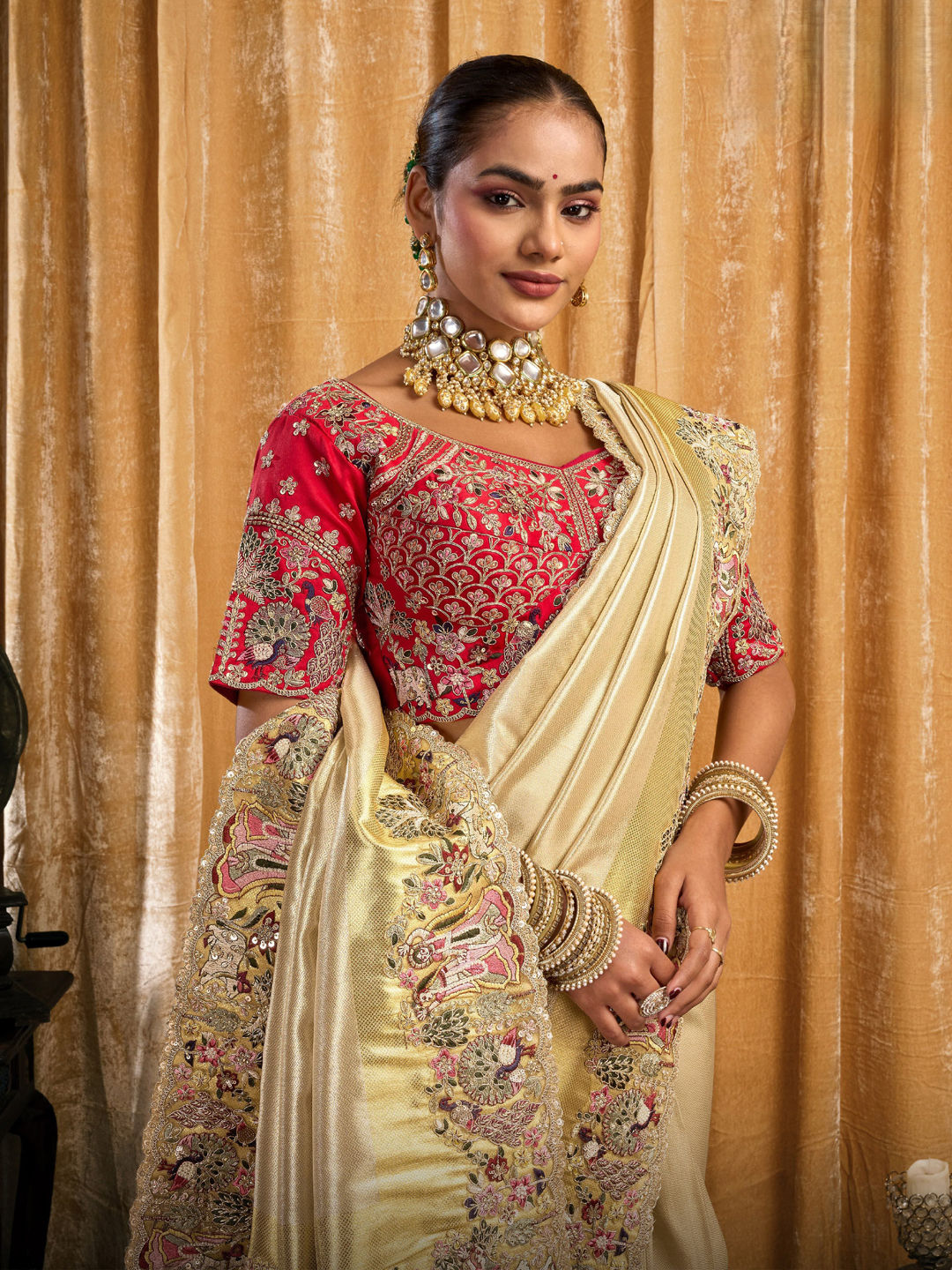 Beige and Brown color Saree in Kanjeevaram Silk fabric with Embroidered, Moti, Sequence, Stone, Zari work