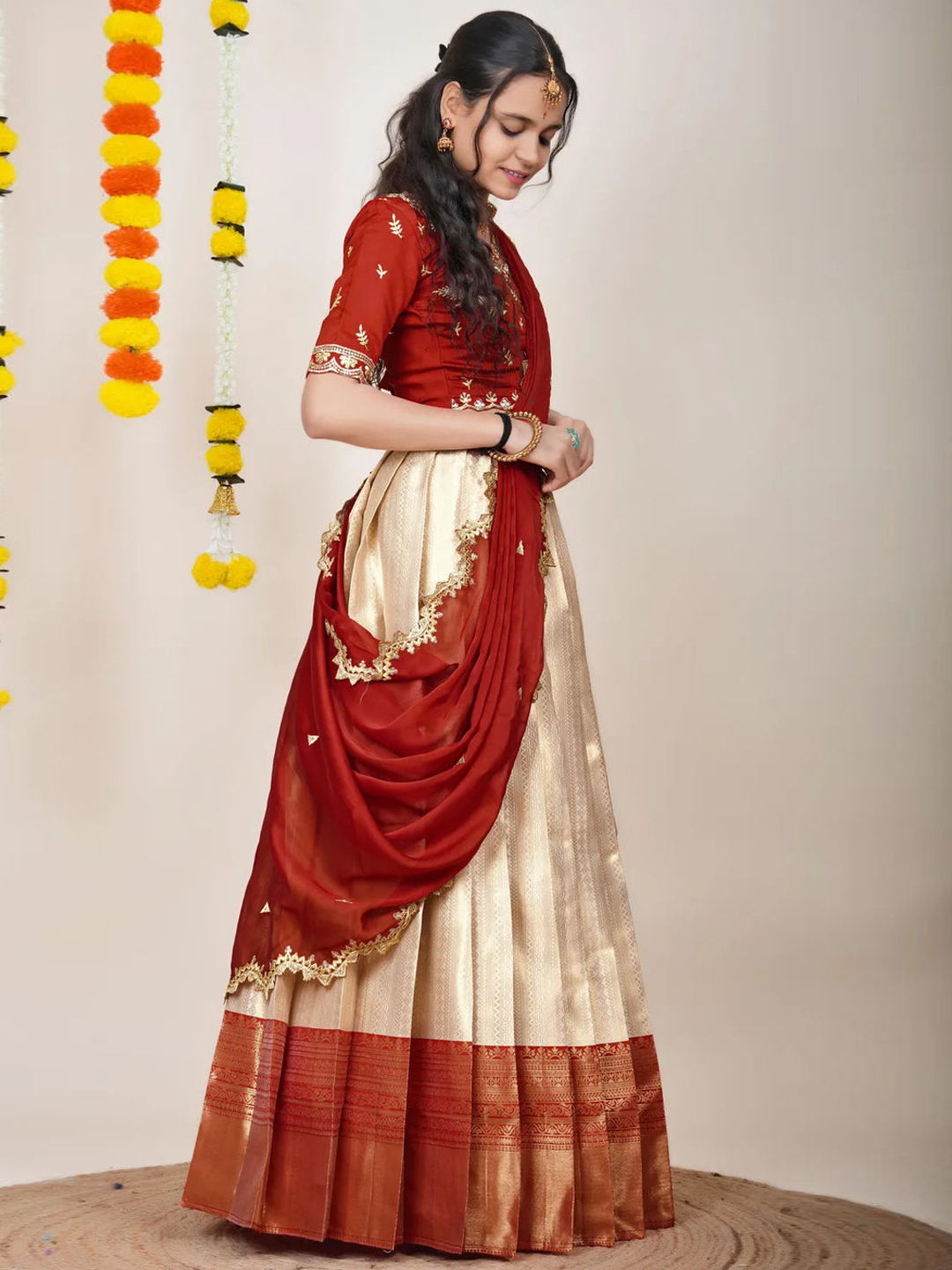 White and Off White color Lehenga in Kanjeevaram Silk fabric with Weaving, Zari work