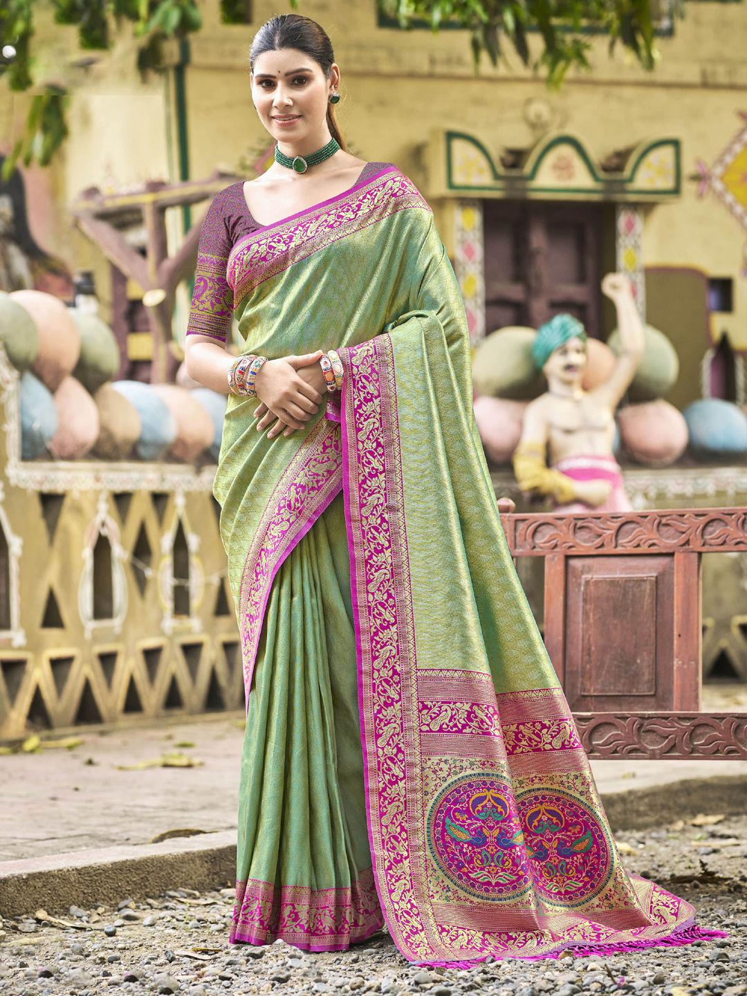 Kanjeevaram Silk Festive Saree in Green with Weaving work