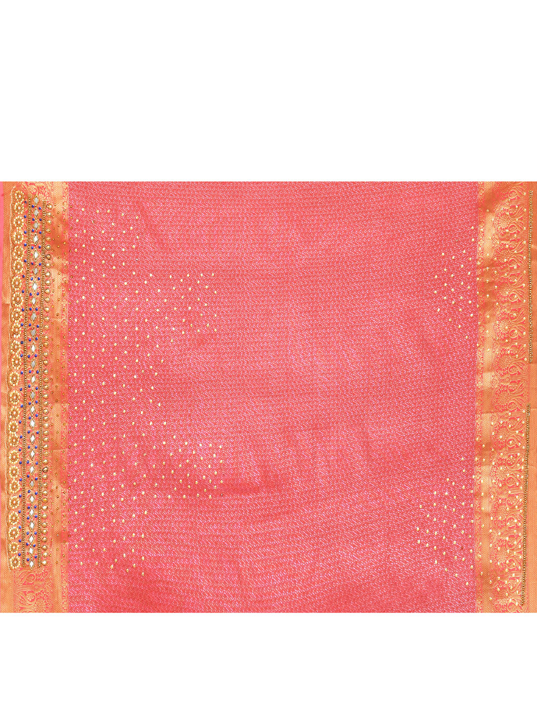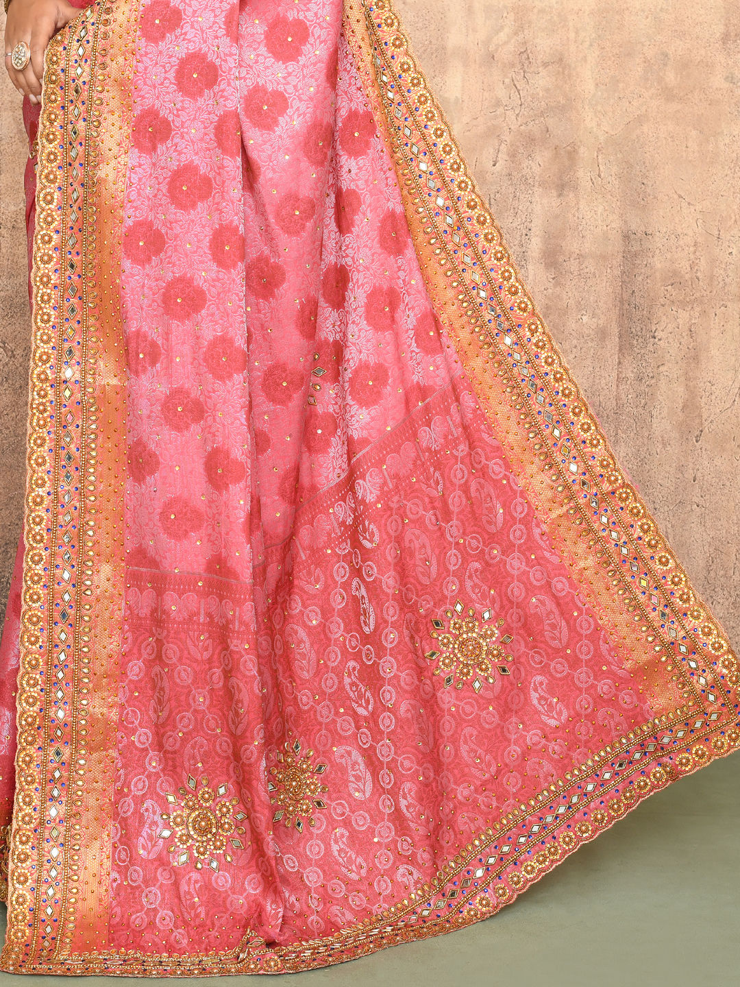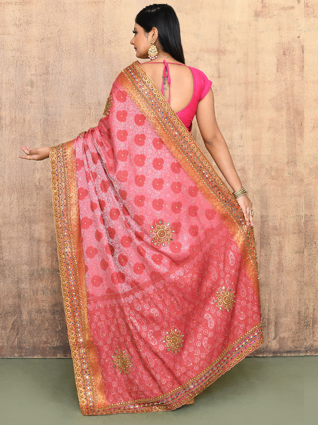 Pink and Majenta color Saree in Kanjeevaram Silk fabric with Bugle Beads, Cut Dana, Mirror, Stone, Weaving work