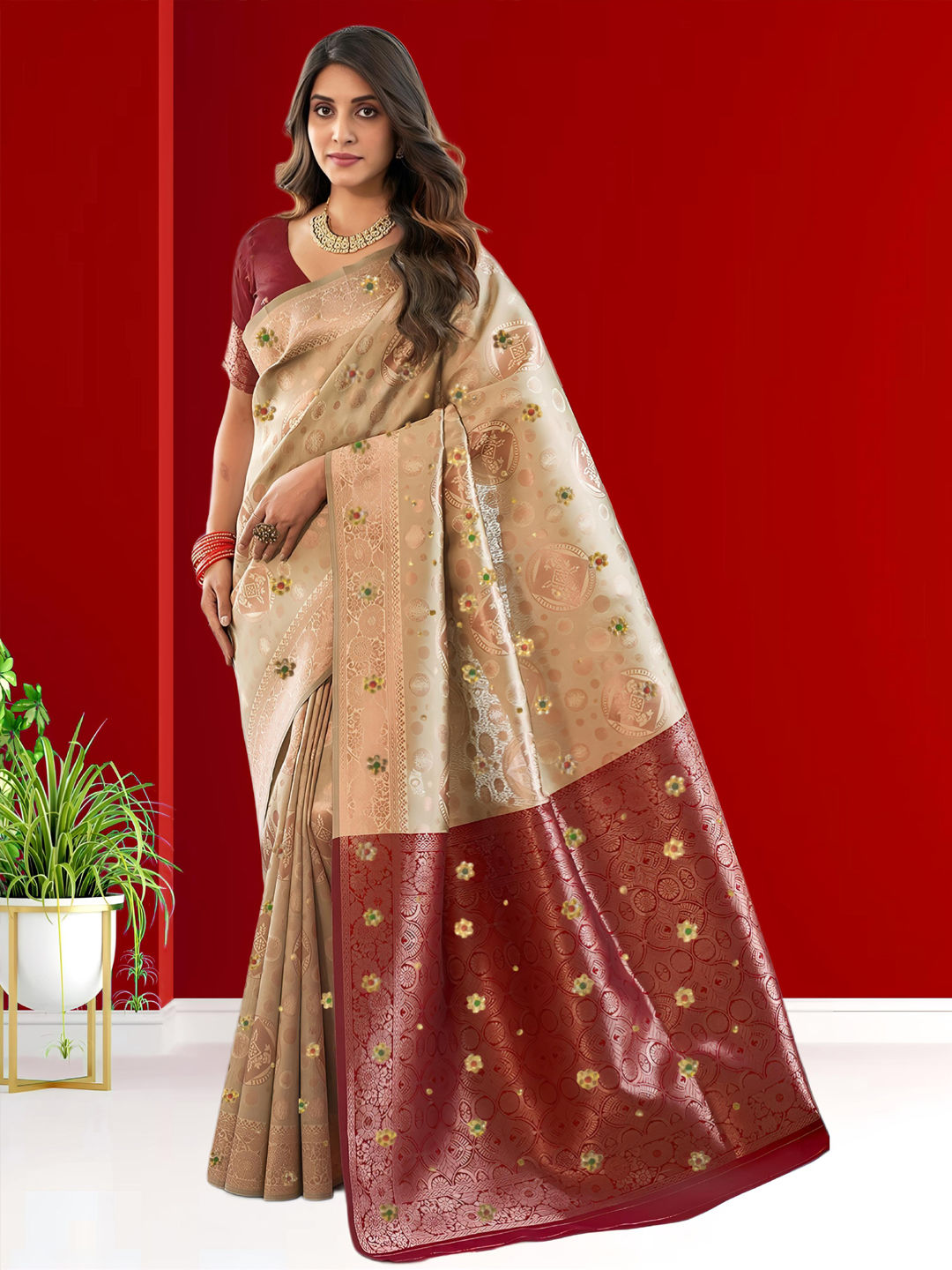 Beige and Brown color Saree in Kanjeevaram Silk fabric with Stone, Weaving, Zircon work